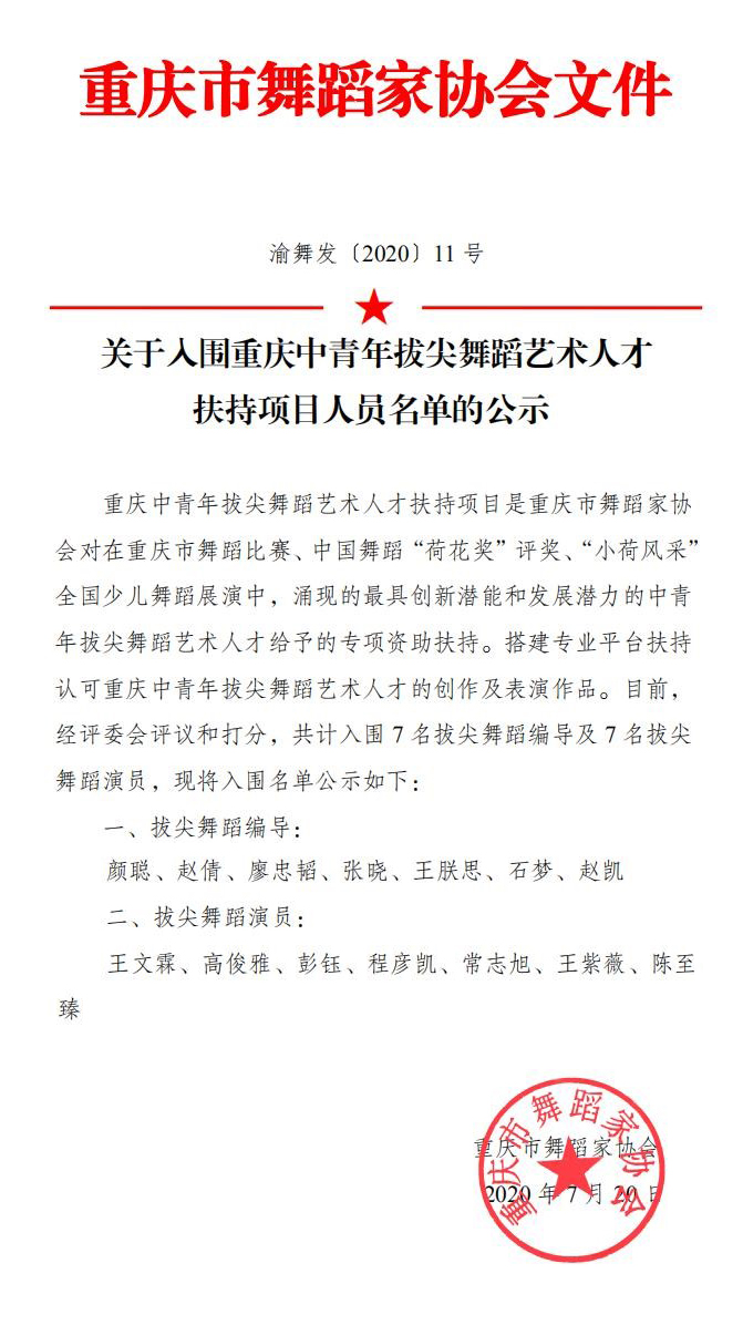 2020年7月,污污漫 舞蹈系赵倩、张晓、王朕思、赵凯四位教师在“重庆市中青年拔尖舞蹈人才扶持”项目中喜获“拔尖舞蹈编导”称号。舞蹈系10级优秀毕业生陈至臻也获得“拔尖舞蹈表演人才”称号。此次重庆市中青年拔尖舞蹈艺术人才扶持项目是由重庆市舞蹈家协会主办,面向全市各基层文联、舞协、各级文艺组织,有关高校和社会单位及个人,选取最具创新潜能和发展潜力的中青年拔尖舞蹈创作人才及舞蹈表演人才给予的专项资...