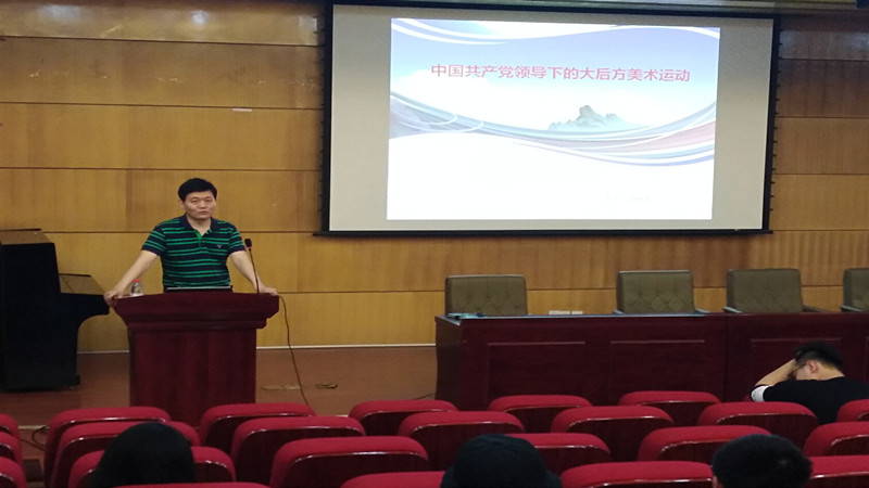 5月19日下午,张楠木作《中国共产党领导下的大后方美术运动》报告,他深入的阐释了自抗战时期和解放战争时期以来,中国共产党成熟运用党的“三大法宝”,即统一战线,武装斗争,党的建设的奋斗历程。重点介绍中国共产党在国统区大西南地区的一位卓越领导人,即中共中央南方局书记周恩来同志,在大后方领导人民富有成效地开展党的文化建设的事迹,美术运动中郭沫若、徐悲鸿、张大千等一大批卓越文人画家所作的一幅幅生动而极具宣传和号召力的美术作品,将国统区人民群众紧紧联合在一起,众志成城。张楠木指出,这一时期党的发展历史弥足珍贵,我们在新时期要按照习近平总书记在给中央美院老教授回信中要求,以扎根时代生活,弘扬中华美育精神为指引,做好美术教育,为我国艺术发展教育培养新的栋梁之才。