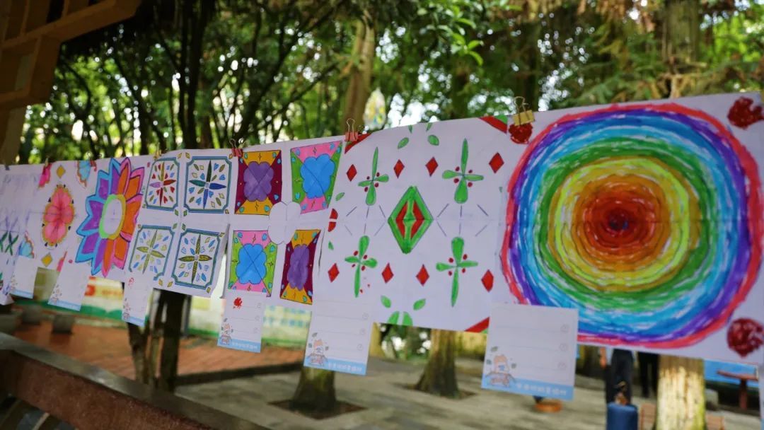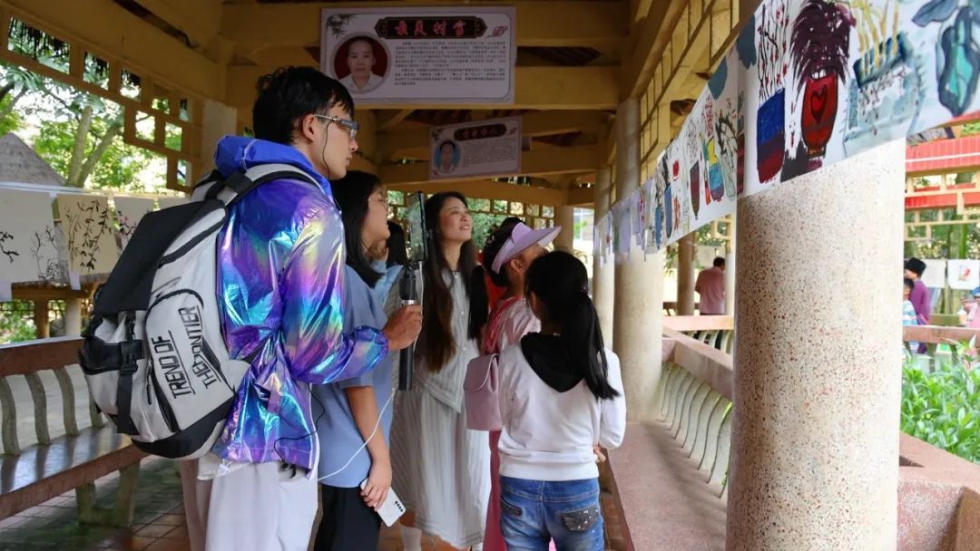 活动现场,一幅幅多彩画作整齐有序的排列在古亭长廊两侧,有师生共绘长卷、国画花鸟、特色版画、民族纹饰、我的家乡风景等作品,并按照作品元素分别设置了国画体验区、版画区、民族元素区、创意区等不同区域进行展示,方便群众参观。此次参展作品形式多样、创意满满,引得参观群众连连称赞,在每一幅画作上也或多或少“结满”了小印章,现场一片热闹。