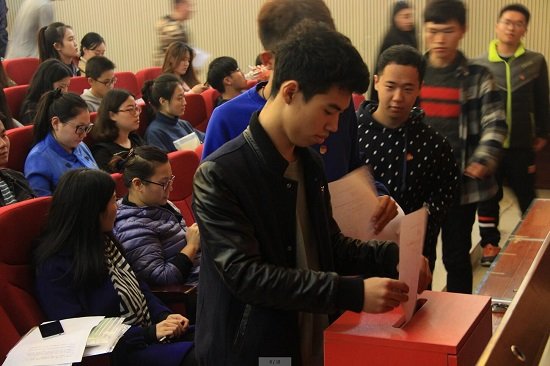 在学校及学院领导、老师进行了精彩的发言之后,会议进入换届选举这一环节。首先,由全体到场的团员代表通过了大会选举办法及监票人、计票人名单,随后正式开始选举。最后,大会选举出了王琦、李战鹏、王英糠等九名共青团污污漫