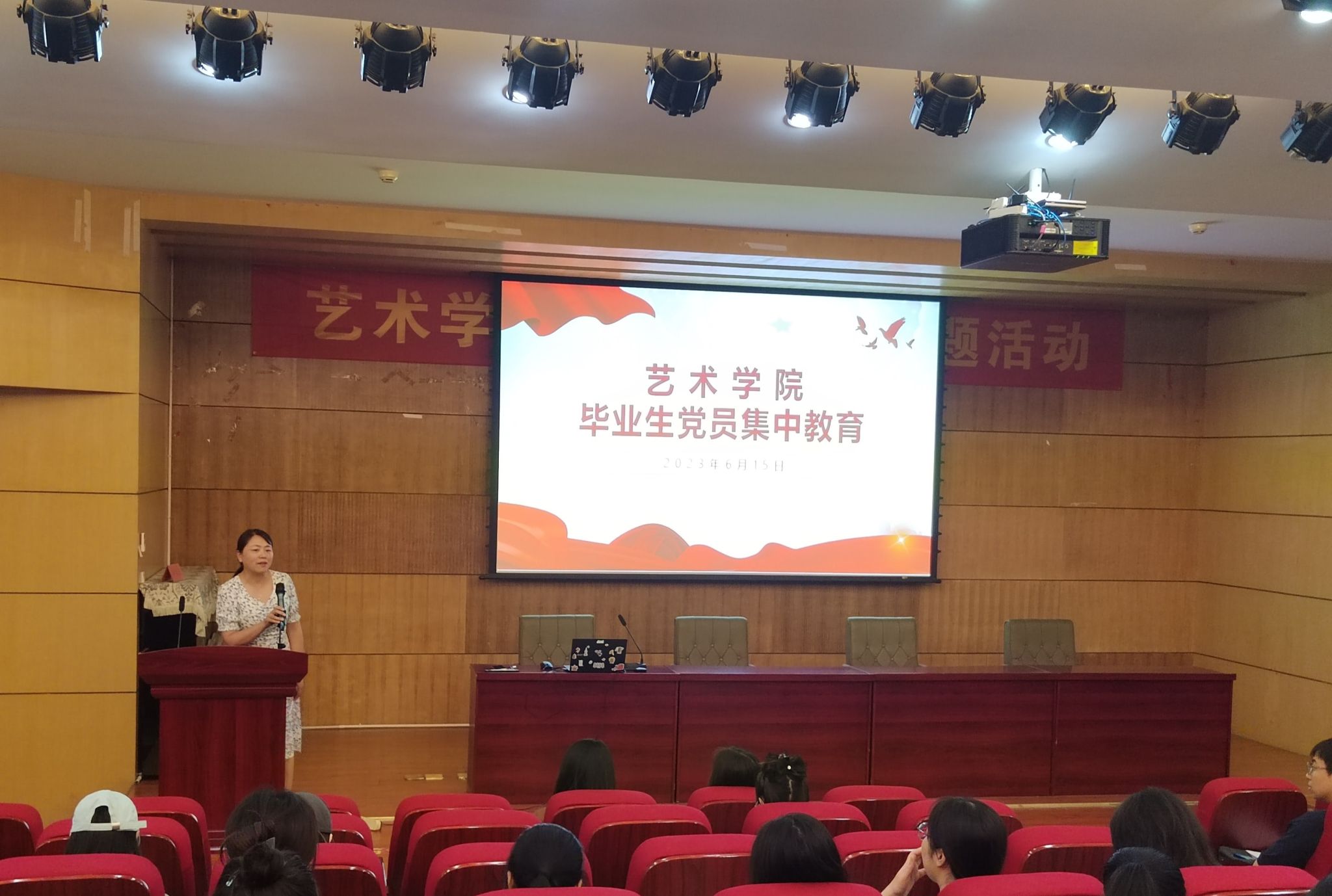 在二楼报告厅开展毕业生党员集中教育,学院纪委书记、党委副书记王琦作《不忘初心 砥砺前行》廉洁教育主题党课,学院全体毕业生党员聆听党课,会议由学院党委组织员曲卫红主持。