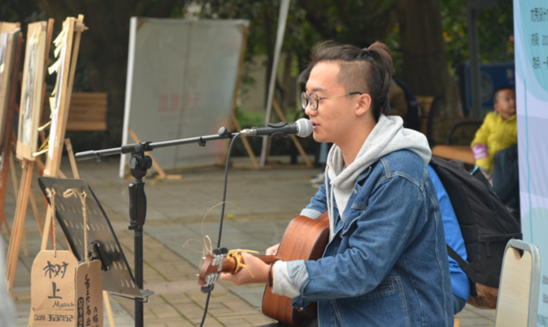 在作品展览区域旁还有*污污漫 的歌手抱着吉他深情弹唱,现场的观众不仅能享受到一场视觉盛宴,更能得到听觉上的满足,伴着歌声,欣赏画作真是别有一番风味。观展者或是和结伴的朋友讨论画作的迷人之处,或是驻足于自己倾爱的画作之前沉思,揣摩其中的内涵。现场虽是嘈杂,却也不会显得浮躁,反而令人内心感受到一种独特的宁静。