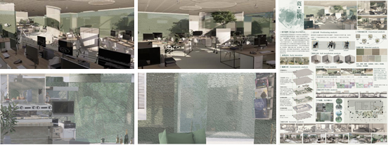 在本次日本概念艺术设计大赛中,由夏青老师指导的室内设计作品《蕤·影镜》是基于新发展格局下的新型办公空间设计,弱化了传统办公空间的场所感,依靠图像的叙事、轻盈的质感在隔墙的质地与光线处理上营造一种偶然性。材料上选择粗糙的肌理漆,覆盖树脂增加空间的虚拟感受,人们可以在有限的室内空间内看到旷野、森林影像。借助图像-体验-空间,植入室外的河流、丛林等影像,弱化室外室内的界限感。通过材质在空间边界的变化,使得办公空间的场所感消隐于刻意创造的自然影像中。