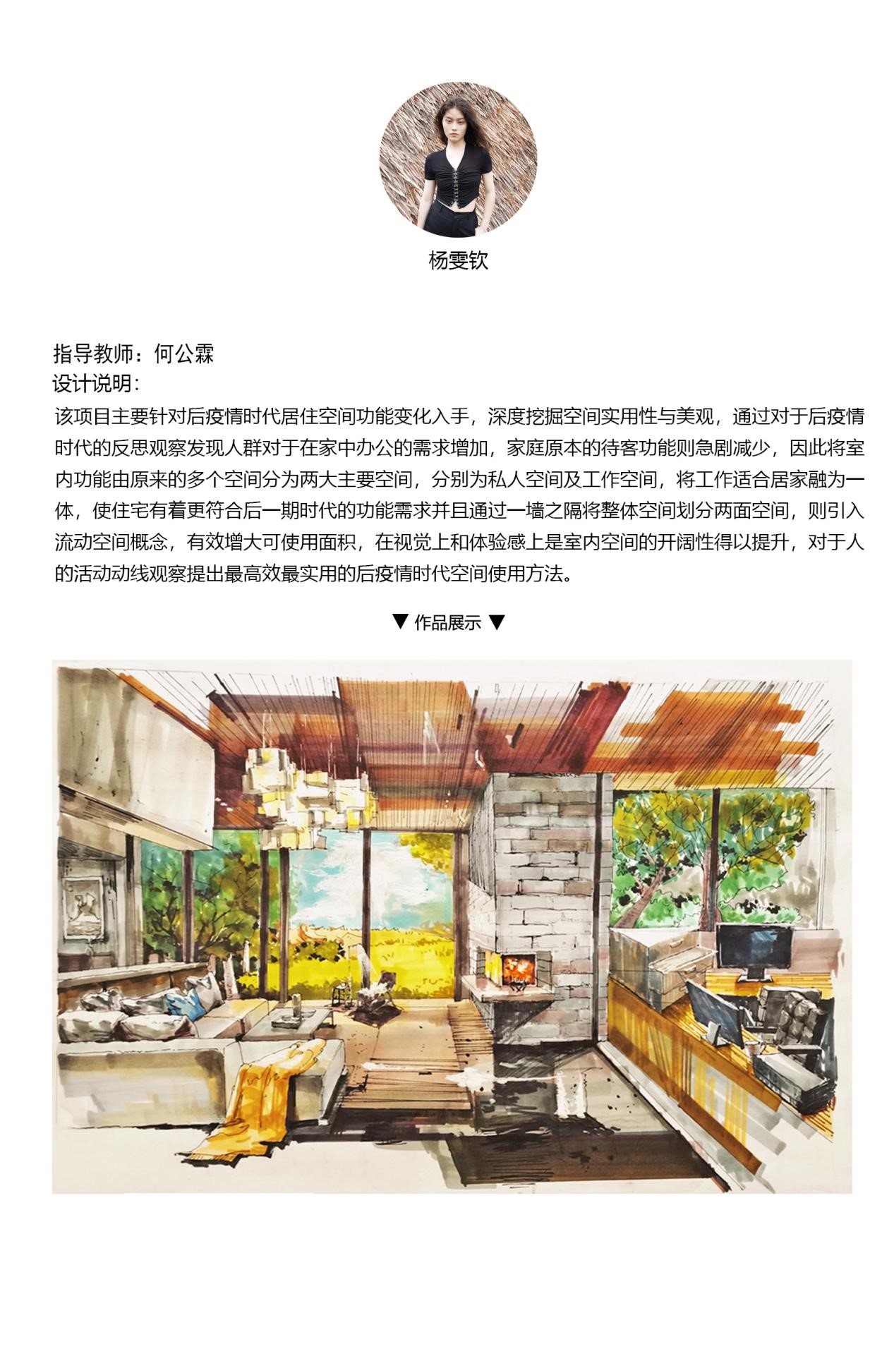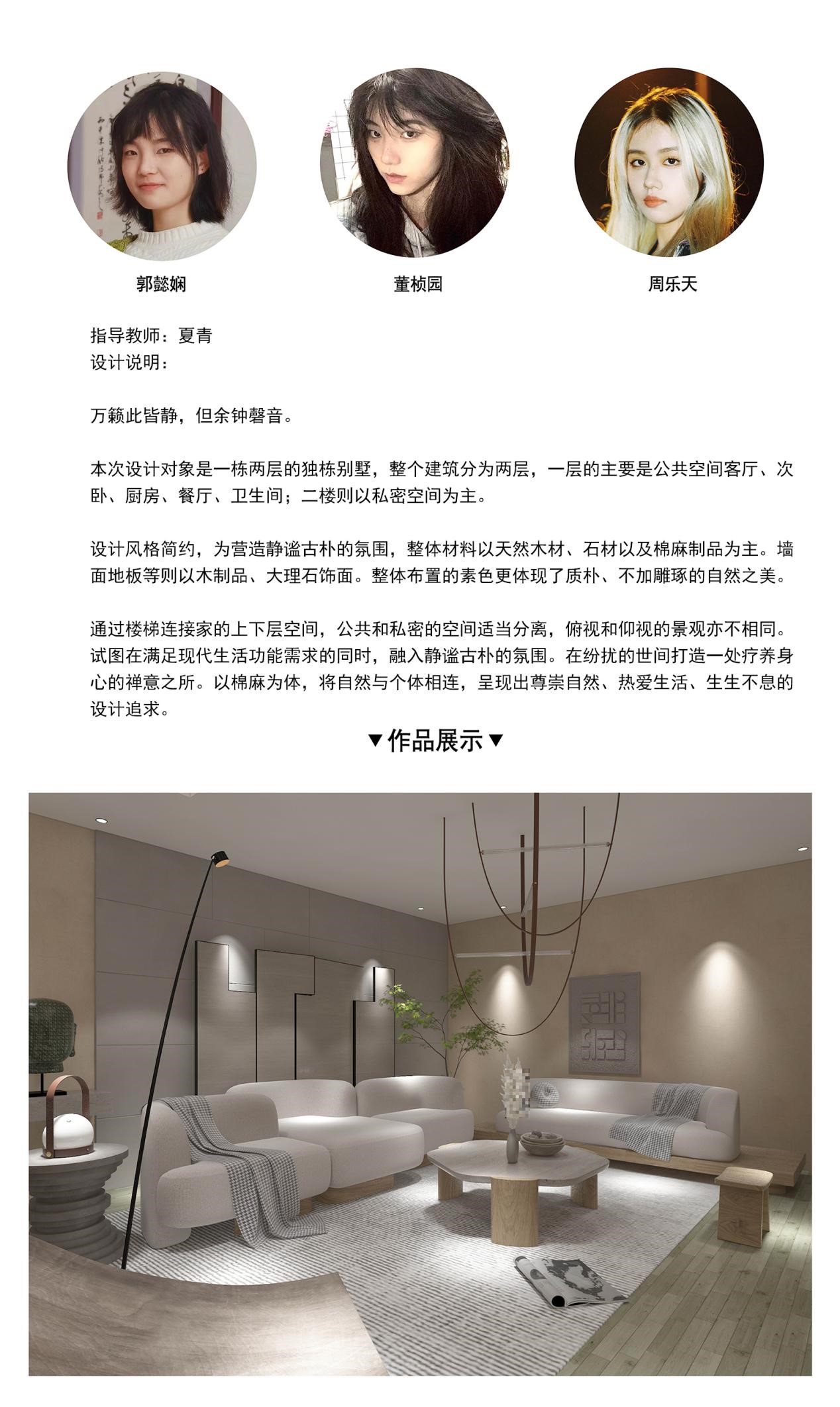 环境设计专业积极组织师生参加了本次艺术设计展,在何公霖、张培颖、夏青老师的指导下,学子们最终斩获多个奖项。其中,李广的《现代有限空间改造项目》;杨雯钦的《“共生”后疫情时代住宅空间功能探索》;刘艺萌和曲晓彤的《重庆印象——大学中央公园设计》;翟雨佳的《AMING别墅》荣获一等奖,万柯和强奥的《侘寂空间》;窦思雨的《穴居》;郭懿娴、董桢园和周乐天的《俯仰有别,与古为新》;黄小芮的《雅舍》荣获二等奖。