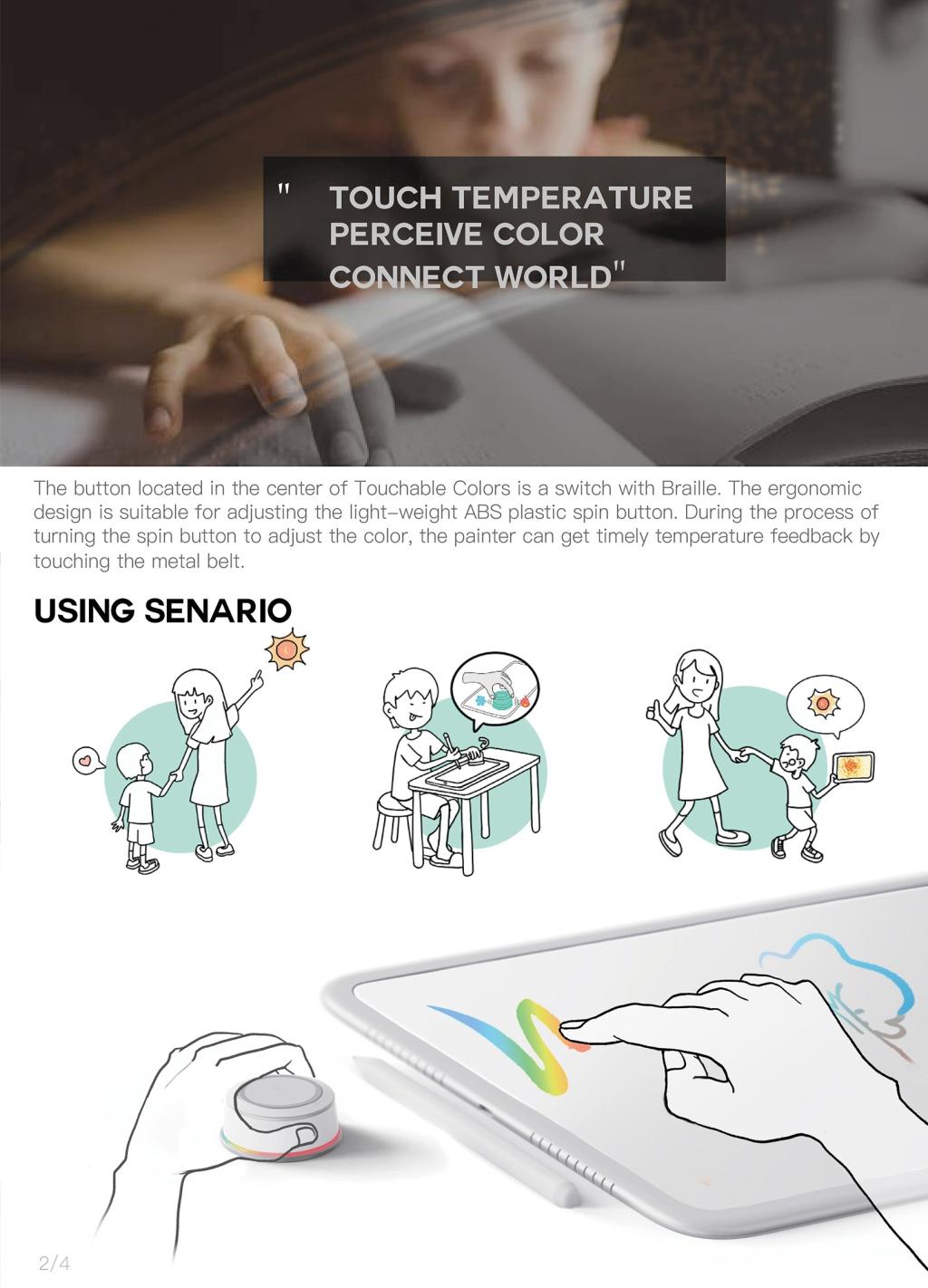 Touchable Colors由夏进军、范正妍、钟姝潇、张荣宇、孙远联合设计完成,是专为色彩感知能力较弱的儿童设计的绘画辅助工具。该产品能够通过蓝牙连接到显示颜色的设备,将颜色的视觉冷暖色转换为触觉温度。基于感知的转变,用户通过使用该产品触摸感知温度,在绘画时调整旋转按钮来控制颜色进行绘画 。通过自我表达和沟通交流与世界建立更紧密的联系,降低该群体存在的潜在心理风险。同时提出了多通道交互方式,为视觉感知能力较弱的群体在未来更好地使用电子设备提供了新的解决方案与可能。