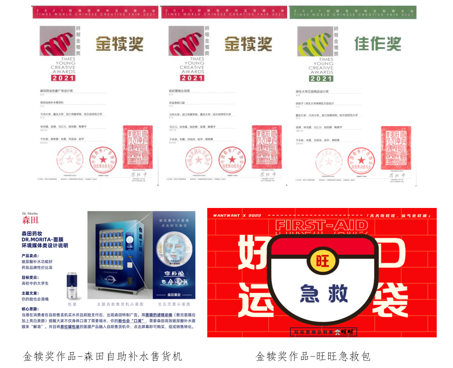 根据赛事规则,所有等级奖作品都将进入2021时报金犊奖全球总决审,与台湾地区及海外地区前三名共同争夺金犊奖、银犊奖、铜犊奖、最佳新锐奖等奖项。共创团队的“森田自动补水售货机”和“好运急救口袋”作品分别被评为森田药妆形象广告设计类金犊奖和旺旺营销企划类金犊奖。