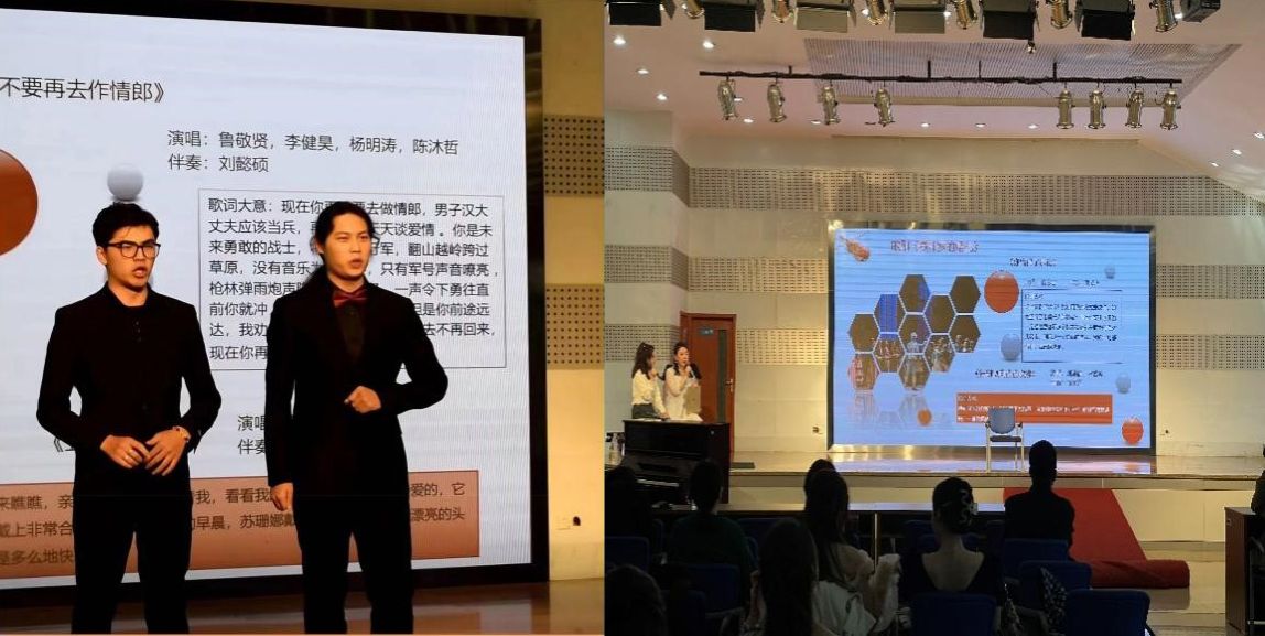 随后,两位老师对歌剧《费加罗的婚礼》《唐璜》的创作背景与音乐风格进行了详细的阐述。同学们对十来首歌剧片段的演绎更是精彩纷呈。舞台上的表演者们配合默契,将音乐与表演相结合,通过独唱、重唱、小合唱等多种演唱形式,展现了声乐艺术的独特魅力,一首首动人心弦的音乐篇章获得满堂喝彩。最后,歌曲《让我们携手同行》将现场氛围推向高潮。