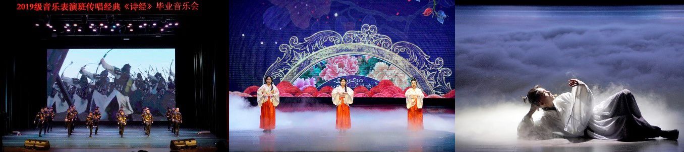 音乐表演作品:2023届音乐表演专业是以“活化中华文明经典,传承中华文明雅韵”为主旨、以《诗经》为元典的综合展演创作。作品吸纳、转化“在心为志,发言为诗。情动于中而形于言,言之不足故嗟叹之,嗟叹之不足故咏歌之。”的艺术创作方法论,以《诗经》开篇《关雎》引入,以《诗经•小雅•鹿鸣》《诗经•国风•郑风》《诗经•国风•秦风》等千古名篇、雅言佳句为创作主体内容。作品通过一咏三叹、视听交感传递、传承中华文化诗教、乐教的情感特质与民族精神,不仅是中华传统文化创造性转化、创新性发展的一次新尝试,也是将中华文明经典转化为音乐教育、人才培养、美育思想资源的创新实践。