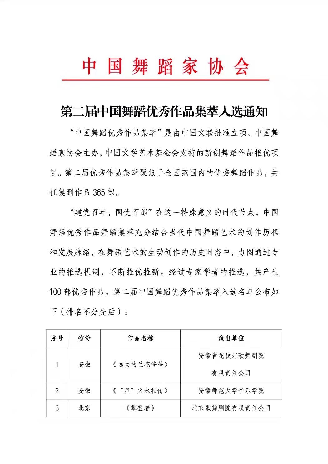 第二届“中国舞蹈优秀作品集萃”面向全国各省、自治区、直辖市舞蹈家协会、艺术院团、高等院校等单位征集舞蹈作品365部,经过专家学者的推选,共产生100部优秀舞蹈作品入选。