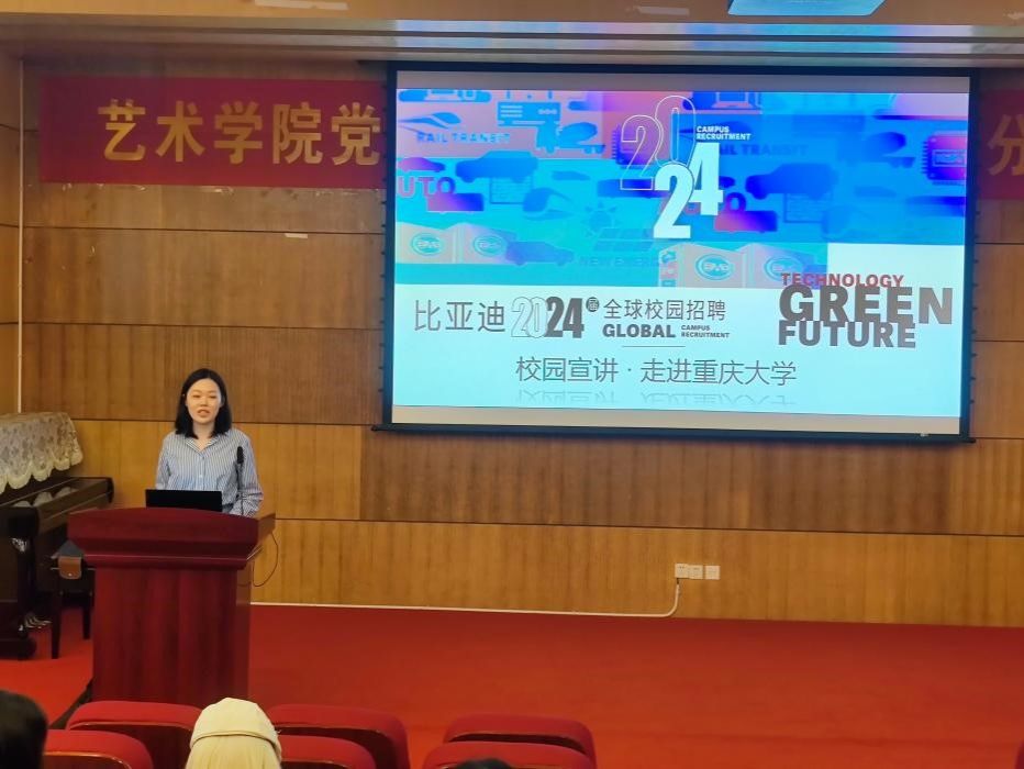 2023年11月28日上午,艺术学院与全球新能源汽车领军者比亚迪携手,在学院报告厅举办了以“汽车造型设计”为主题的专场招聘会。招聘会由毕业班辅导员杨传国主持,学院2020级、2021级产品设计专业和视觉传达专业部分学生参加。