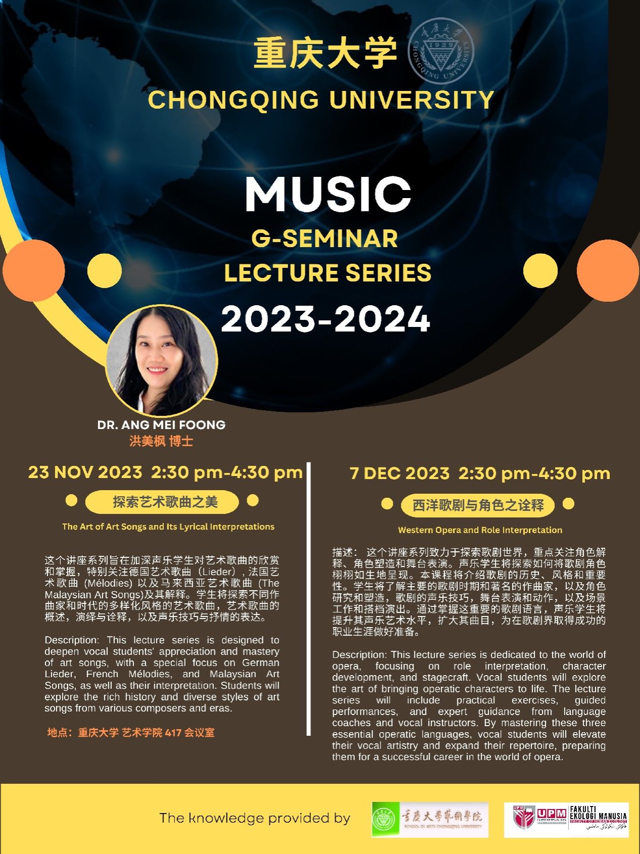 第一场讲座于11月23日(星期四)下午2:30—4:30,由马来西亚博特拉大学洪美枫(Ang Mei Foong)博士主讲,题目为《探索艺术歌曲之美》。线下地点在*污污漫 417会议室。
