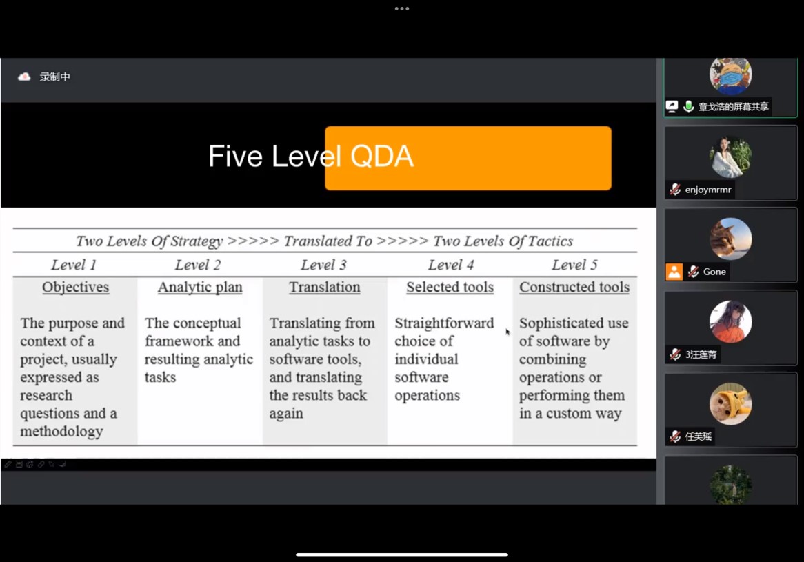 讲座互动环节师生们的提问热情十分高涨。其中,公共管理学院张楠副教授提问运用软件将访谈材料拆分后,在提炼规律时可以结合哪些更好的方式来开展理论研究。章教授回应指出,其一从访谈材料本身出发寻找编码之间的关联,将访谈材料置于群组,按照具体考虑因素寻找属性与编码之间关系,最后将材料关联叠加放置网络的方法较利于形成初步框架。其二,基于学术阅读爬梳已有研究理论和经验,并尝试将其与当前访谈材料进行关联和链接而非直接套用,并不断回顾检验最终即可形成自己的理论提炼和归纳。