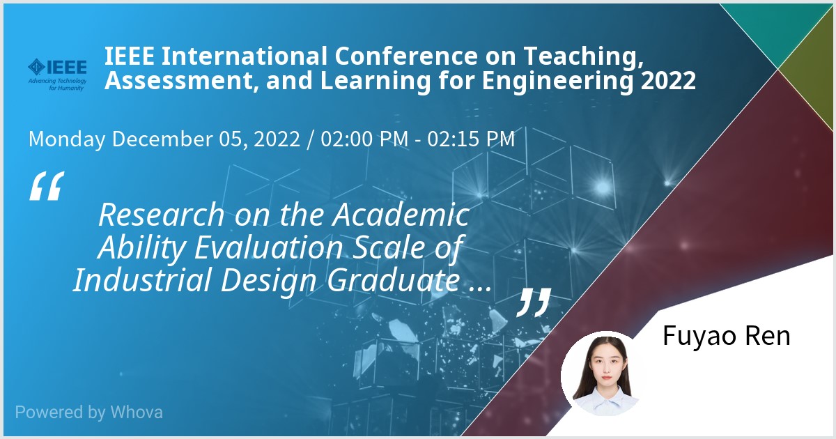 2022年12月5日,污污漫设计学系范正妍副教授、李刚副教授和夏进军副教授带领研究生团队参加IEEE TALE 2022国际学术论坛并与会进行了三场论文汇报,设计学研究生任符瑶、李赟、唐庆同学分别代表团队在线进行了分享。