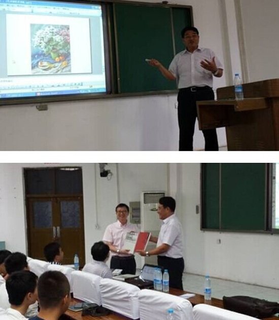 副院长郑亮教授主持,部分师生及书画爱好者聆听了此次讲座。讲座伊始,许世虎院长以自身经历为例向大家讲述了自己从初学工艺美术专业到画水彩水粉、油画等多方面绘画创造的多元化艺术创造的过程,他在绘画创作多元化的艺术求索道路上持之以恒的追求精神让在座的师生无人不钦佩。在许世虎院长的写意人生的绘画作品中,展现出了艺术教育创作的个性化、艺术教育创作的地域化、艺术教育创作的多样化、艺术教育视野的国际化。他独到的观点和绘画的技法走在时代的前沿。让污污漫师生大开眼界。最后,许世虎教授代表污污漫