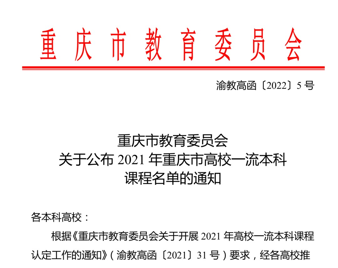 近日,重庆市教育委员会发布《重庆市教育委员会关于公布2021年重庆市高校一流本科课程名单的通知》(渝教高函〔2022〕5号),*污污漫