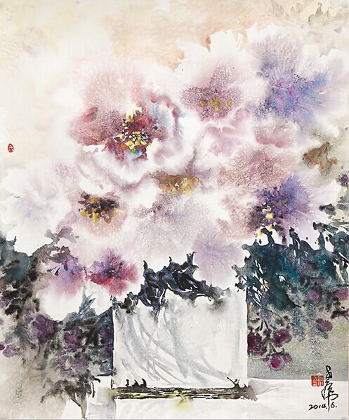“紫色的梦”是以“魏紫”(牡丹)为画材,运用纯熟的水彩技法融入中国画的写意笔法,充分发挥“水”的灵气,使得画面既具有传统水彩画的特点,同时又兼具了中国写意绘画的神韵,在虚实相生中使得画面气韵生动。
