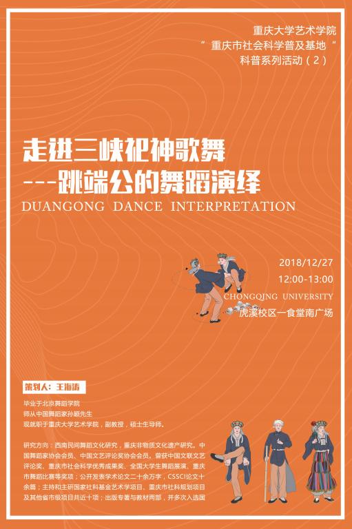 科普系列活动之一《走进三峡祀神歌舞——跳端公的舞蹈演绎》的成功举办,开启了普通大众对“非遗舞蹈”和“三峡文化”的有趣探索,拓展了高校学生们的艺术视野,促进了学生们对传统民俗文化的价值认同,使学生们更好地体会到中国传统艺术的魅力和价值。(图文:王海涛)
