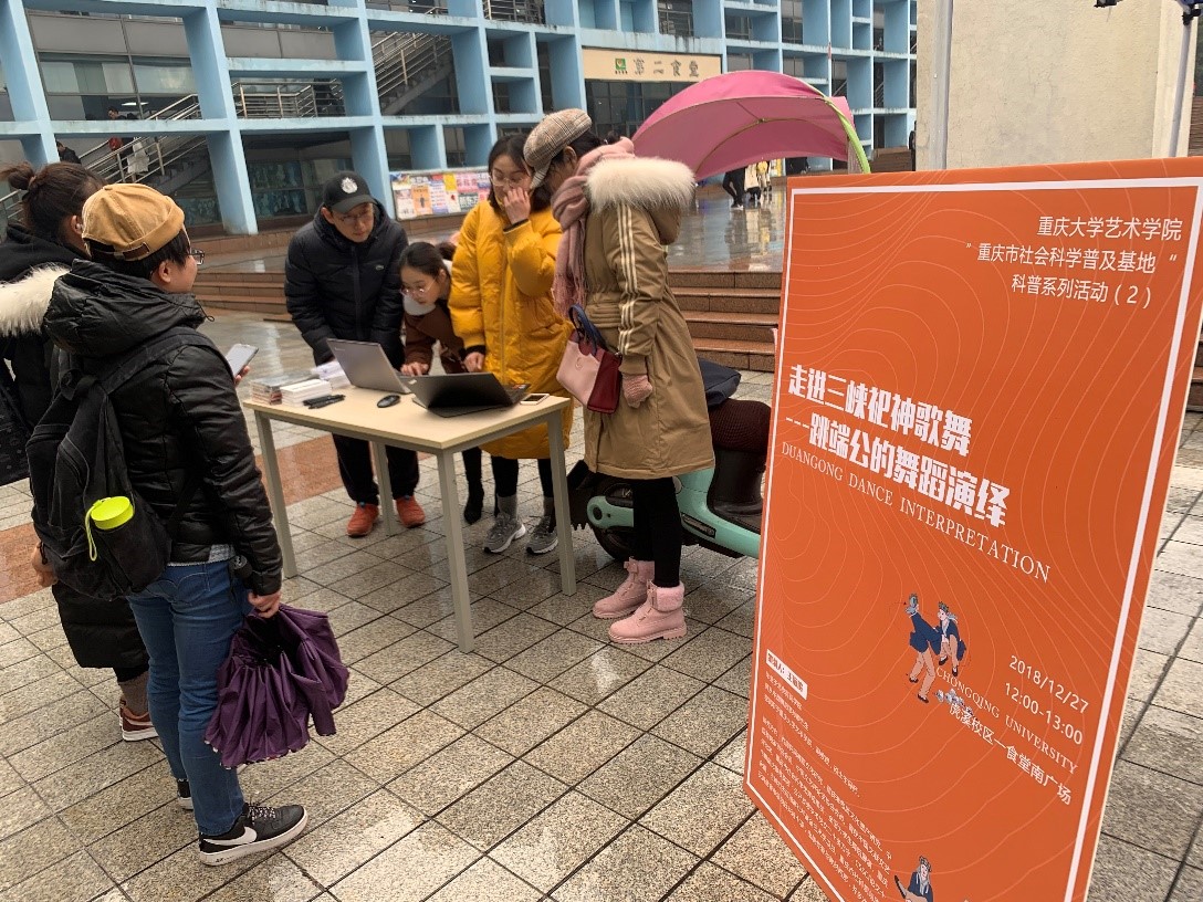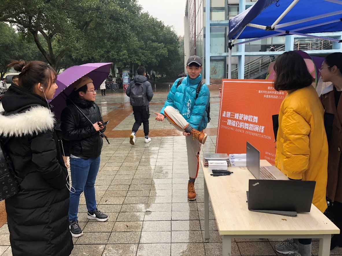 虎溪校区一食堂广场举办了“重庆市社会科学普及基地“2018年科普系列活动之一《走进三峡祀神歌舞——跳端公的舞蹈演绎》科普活动。活动主题鲜明,形式多样,趣味性强,引来大批学生驻足,并积极参与活动。现场气氛活跃,科普活动圆满成功。