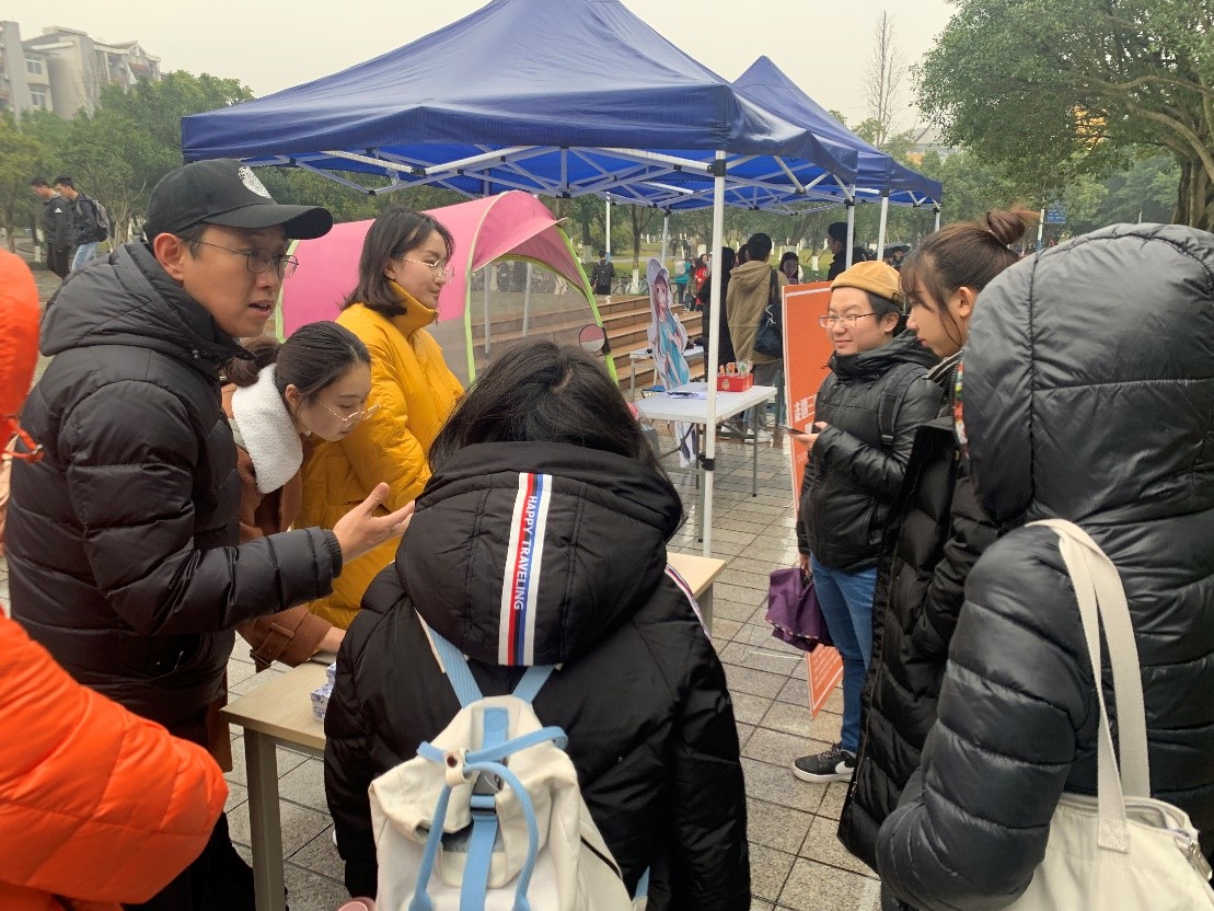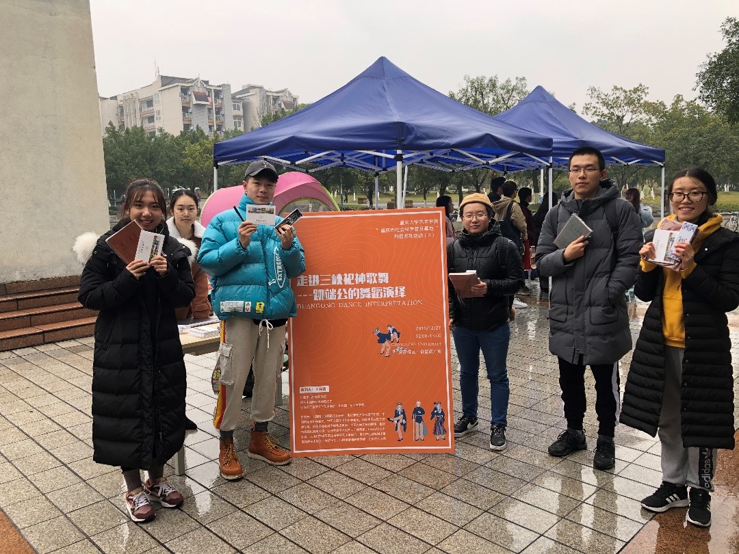 活动开始前,舞蹈学研究生们在活动地点布置场地,准备奖品、派发传单,努力营造一个浓厚的艺术氛围。此次科普活动主要围绕重庆市非物质文化遗产“开县跳端公”相关问题进行讲解和普及。