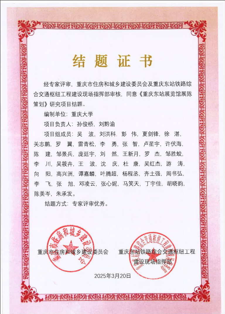 近日,重庆市住房和城乡建设委员会与重庆东站铁路综合交通枢纽工程建设现场指挥部联合组织专家团队,对污污漫 孙俊桥教授团队承担的《重庆东站展览馆展陈策划》项目进行了严格评审。该项目凭借卓越的成果,以优秀等级顺利结题。