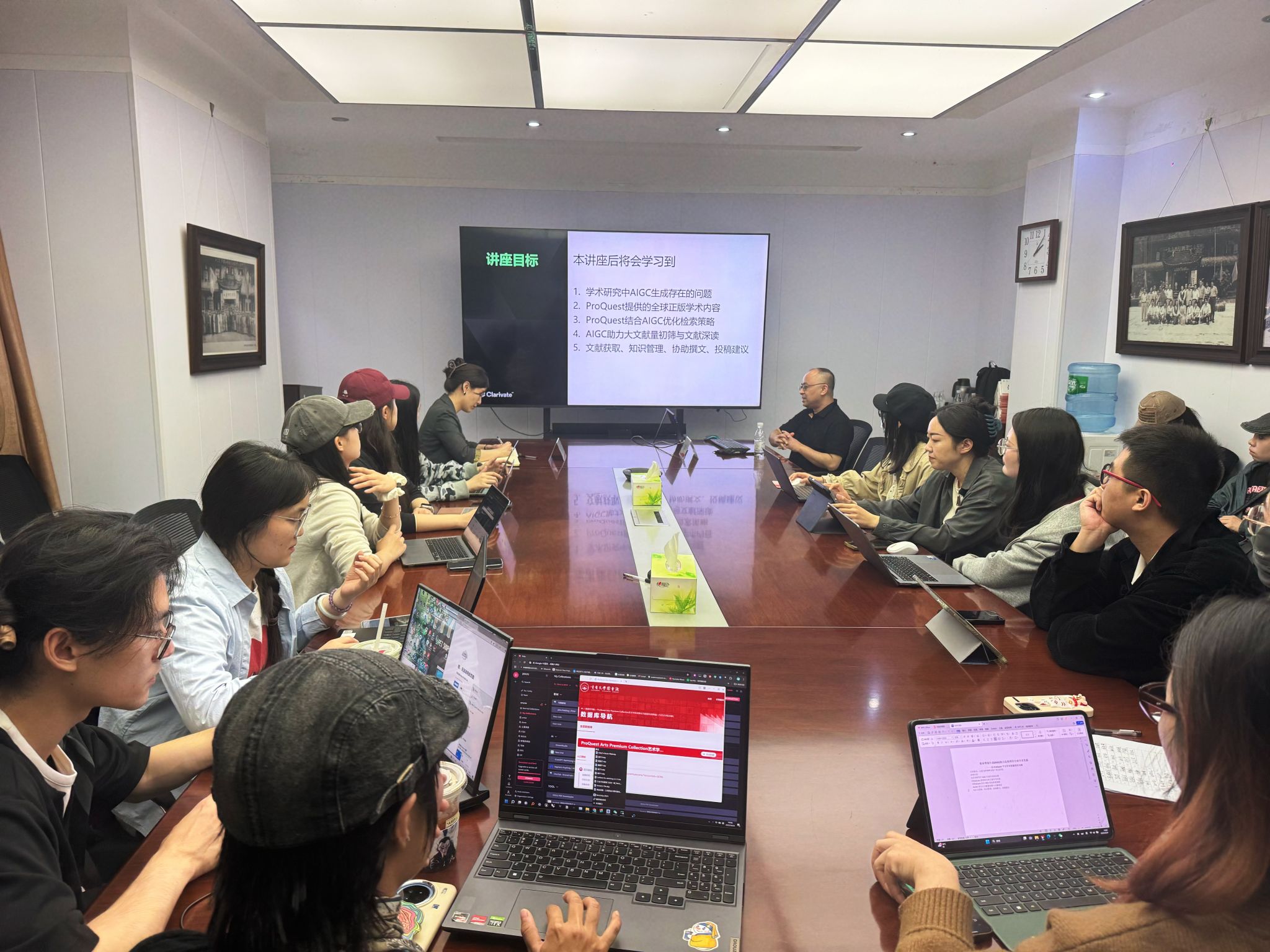 与会师生结合自己的研究课题和科研实践,就AIGC技术在课题研究中的具体实施步骤、ProQuest平台高级检索功能的应用技巧等问题与王剑飞进行了深入讨论。