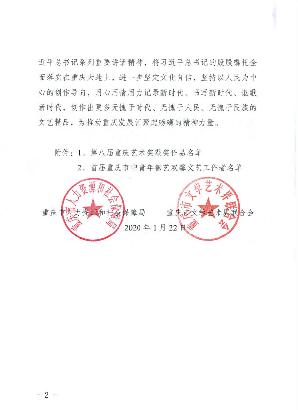 日前,为表彰先进、激励典型,重庆人力资源和社会保障局、重庆市文联联合评定并公布了第八届重庆艺术奖和首届重庆市中青年德艺双馨文艺工作者称号获奖名单,希望广大艺术家和文艺工作者以之为榜样,学习贯彻习近平总书记系列重要讲话精神,将习近平总书记的殷殷嘱托全面落实在重庆大地上,进一步坚定文化自信,坚持以人民为中心的创作导向,用心用情用力记录新时代、书写新时代、讴歌新时代,创作出更多无愧于时代、无愧于人民、无愧于民族的文艺精品,为推动重庆发展汇聚起磅礴的精神力量。
