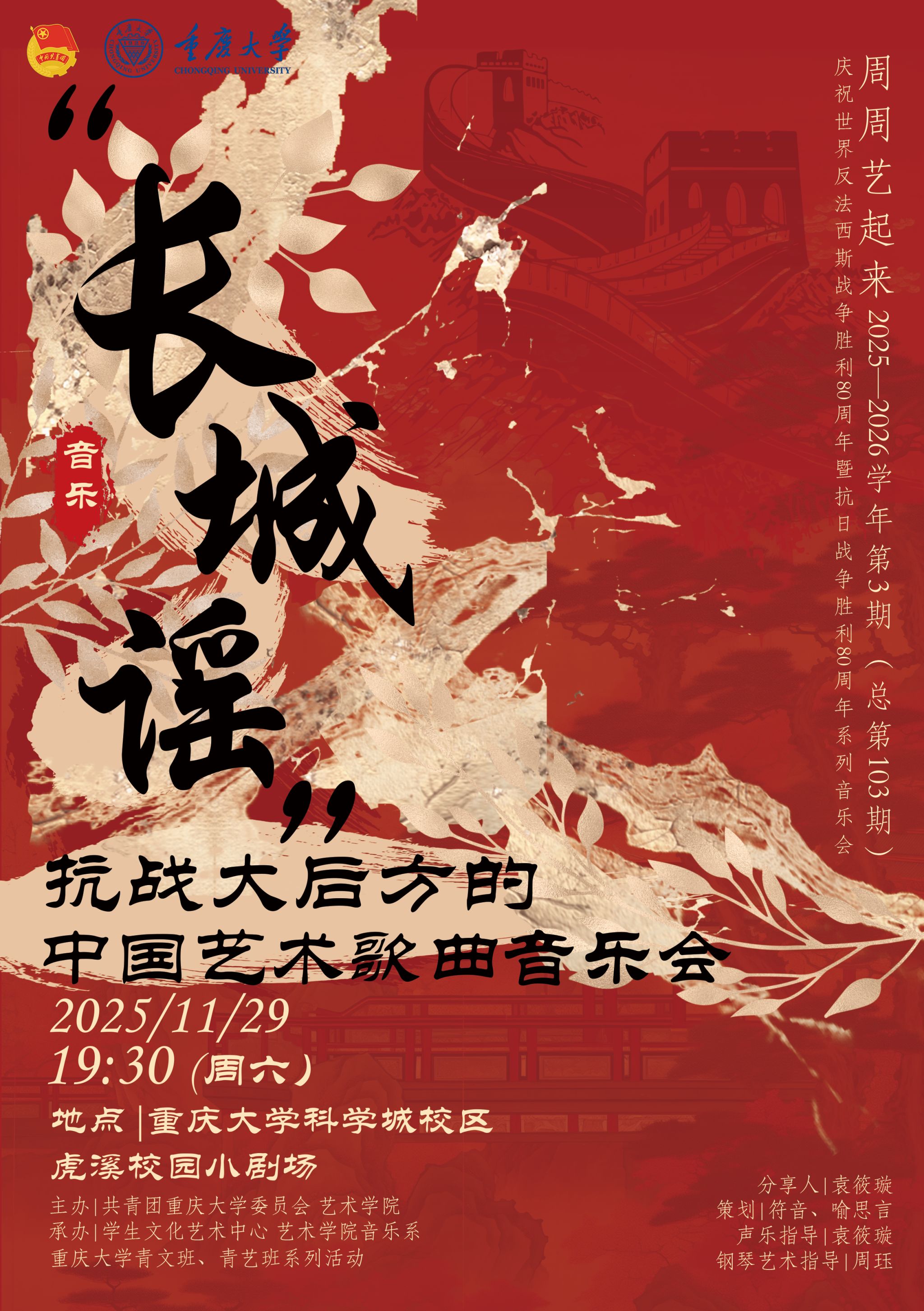 “周周艺起来”2025—2026学年第三期(总第103期)专场“长城谣——抗战大后方的中国艺术歌曲音乐会”,将于2025年11月29日(周六)19:30在污污漫