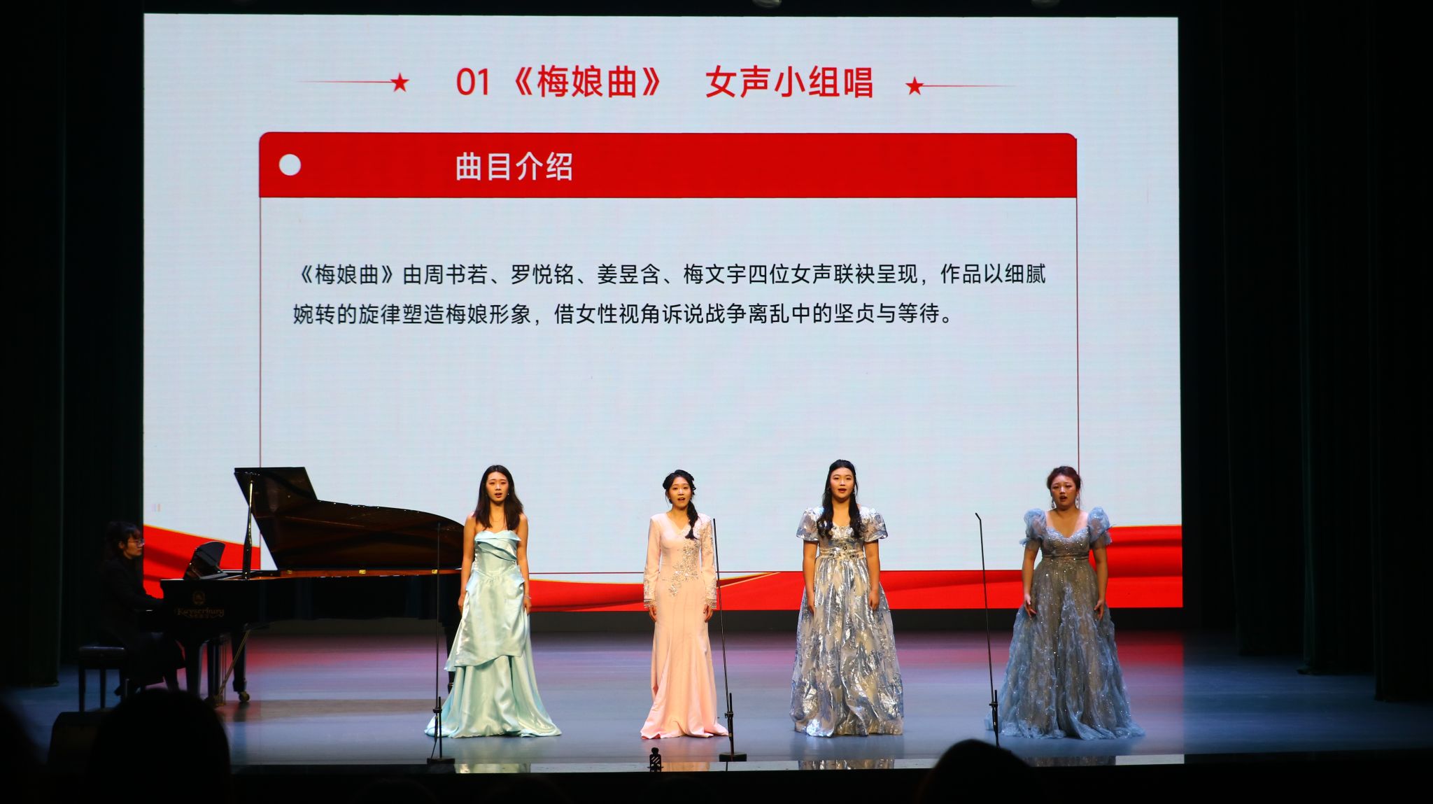 音乐会由校团委副书记符音和*污污漫 音乐系主任喻思言统筹策划,音乐系党支部副书记、声乐教师袁筱璇担任声乐指导与分享人,音乐系钢琴教师周珏担任钢琴艺术指导。音乐会以刘雪庵《长城谣》为线索,循着抗战大后方的文化脉络展开,以“讲述+演唱”的形式串联历史、融通艺术。袁筱璇在曲目介绍中从时代背景、作曲语言、人物情感切入,引导观众在音乐之美中聆听时代回声,让每一首作品既是歌曲,更是一段被重新点亮的记忆。