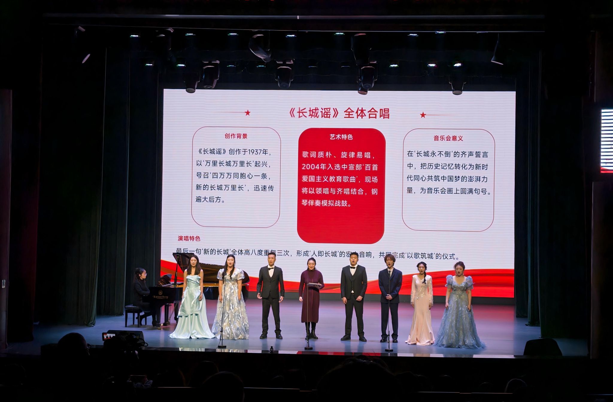 由谭理搏、吉乃拉布、周书若、姜昱含、罗悦铭、梅文宇、陈光灿等同学演绎的抗战歌曲,展现了青年学子的艺术风采与团队精神。喻思言带来的独唱《思乡曲》,以其精湛的技艺和饱满的情感,将音乐会推向高潮。音乐会在全体演职员齐唱《长城谣》的热烈氛围中圆满落幕。