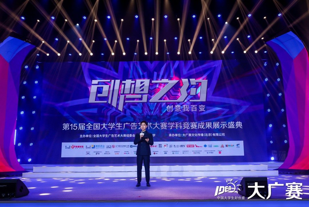 石俊峰同学作为唯一一位获奖学生代表,在颁奖盛典现场发言。他谈到:“在创作过程中,我反复思考,如何能精准体现品牌需求的同时,使作品有较高的审美价值与经得起推敲的细节,既要体现品牌文化、彰显品牌个性;又要满足消费者趋向于探索内心深处的情感需求。”他参赛四年的宝贵经验与心得体会分享,激发了在场师生的情感共鸣。