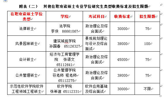 2015年招收在职人员攻读硕士学位,包括法律、工程、风景园林、公共管理、会计、示范性软件学院软件工程领域工程硕士,以“进校不离岗”的方式在职攻读硕士专业学位,为我国企业、工程建设部门、政法部门及政府机构培养应用型、复合型高层次技术和管理人才。