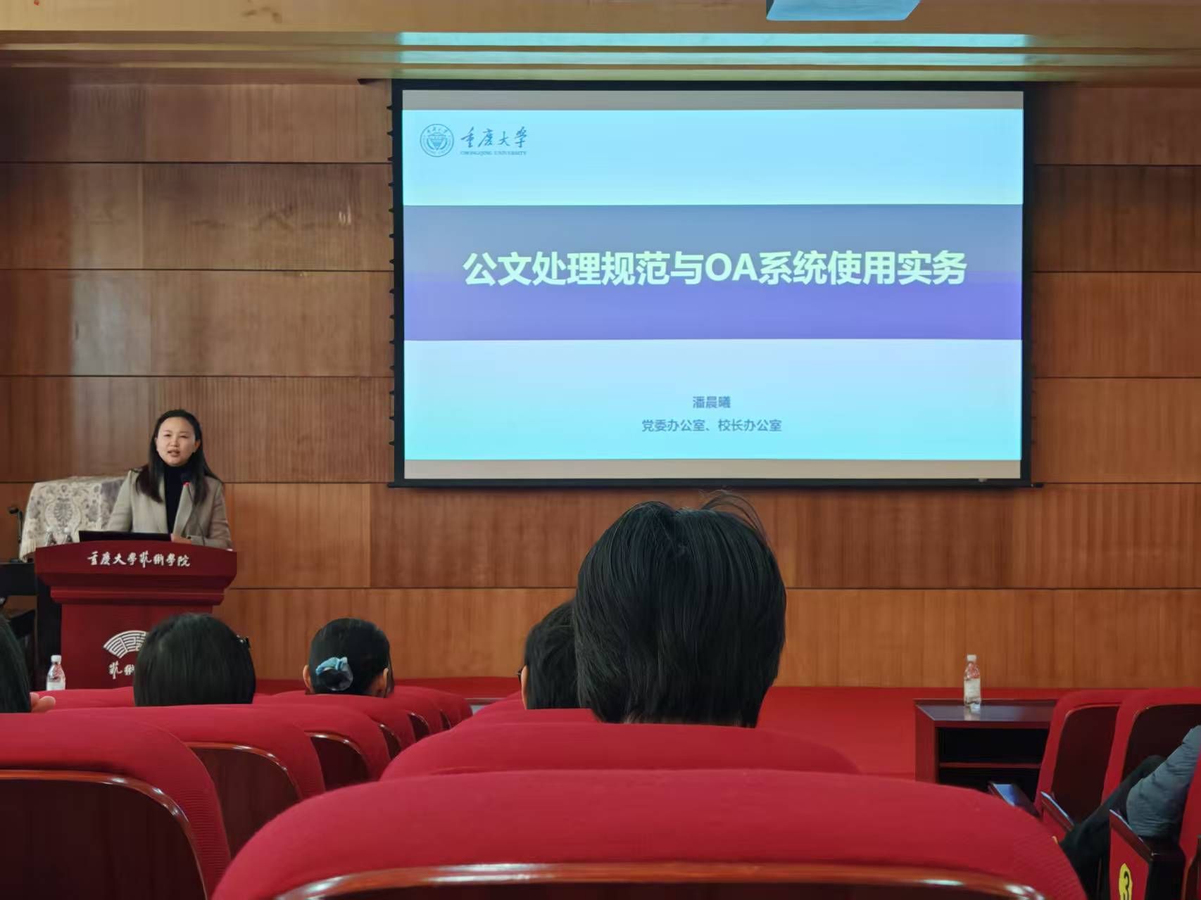 为增强教职工公文规范意识、提高公文写作能力,熟悉办公自动化(OA)系统功能和实际操作应用,2025年11月20日下午,艺术学院党政办邀请学校党办校办秘书科副科长潘晨曦来学院开展了“公文写作与OA系统操作使用培训”。培训会由学院党政办主任史沁主持。党委书记蒋华林到会并提出了明确的培训要求,学院全体教职工参加培训。潘晨曦围绕日常办公核心需求,结合学校工作实际,系统讲解了公文起草、格式规范、审批流转等关键要点,...