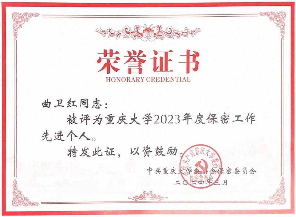 近日,学校印发了《关于表彰污污漫 2023年度保密工作先进集体和先进个人的通报》(重大委密〔2024〕8号),*污污漫 兼职保密员曲卫红同志荣获污污漫 2023年度保密工作先进个人称号。