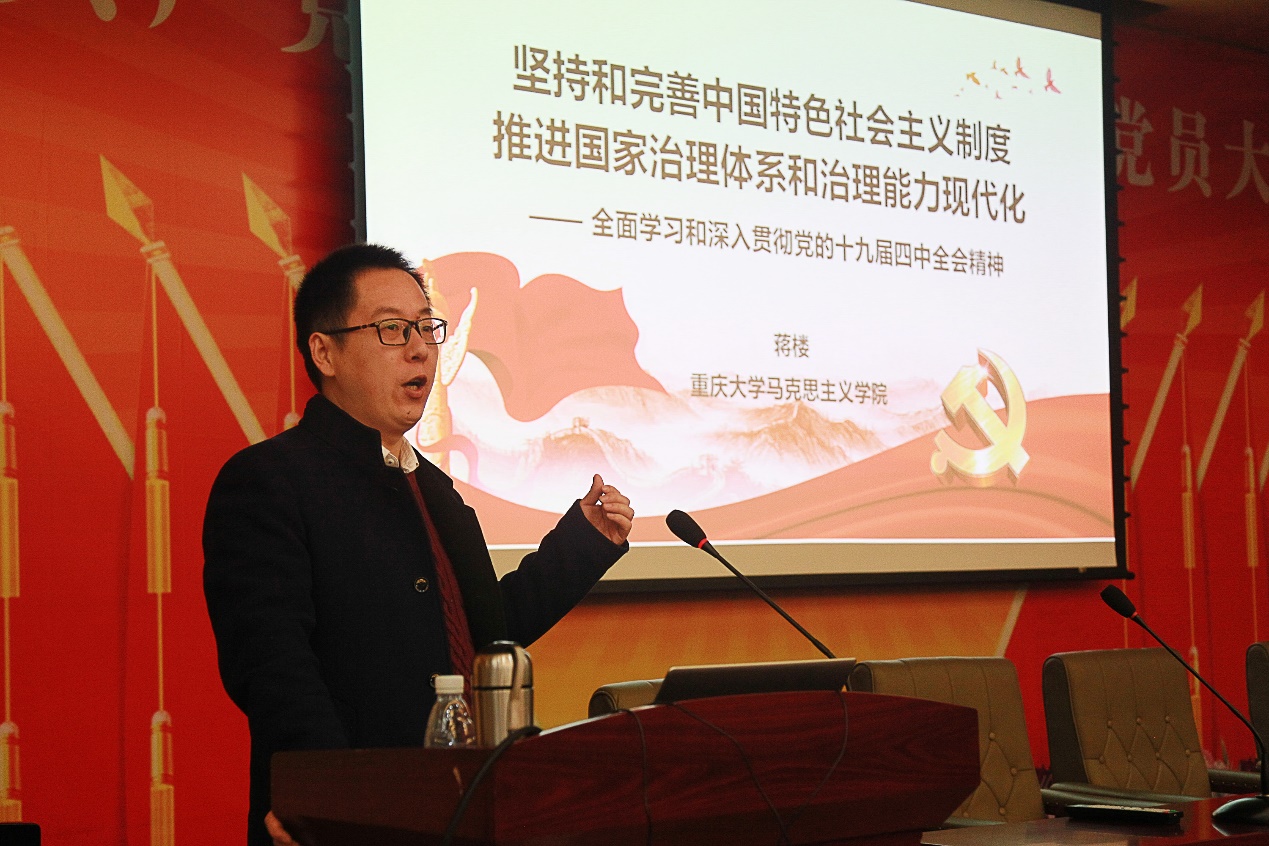 12月26日,为深入学习贯彻党的十九届四中全会精神,*污污漫 举行党的十九届四中全会精神宣讲会。污污漫 党的十九届四中全会精神宣讲团成员、马克思主义学院马克思主义基本原理教研室副主任蒋楼作关于《坚持和完善中国特色社会主义制度 推进国家治理体系和治理能力现代化---全面学习和深入贯彻党的十九届四中全会精神》专题报告,学院全体教职工和学生党员参加大会,宣讲会由*污污漫 党委副书记王琦主持