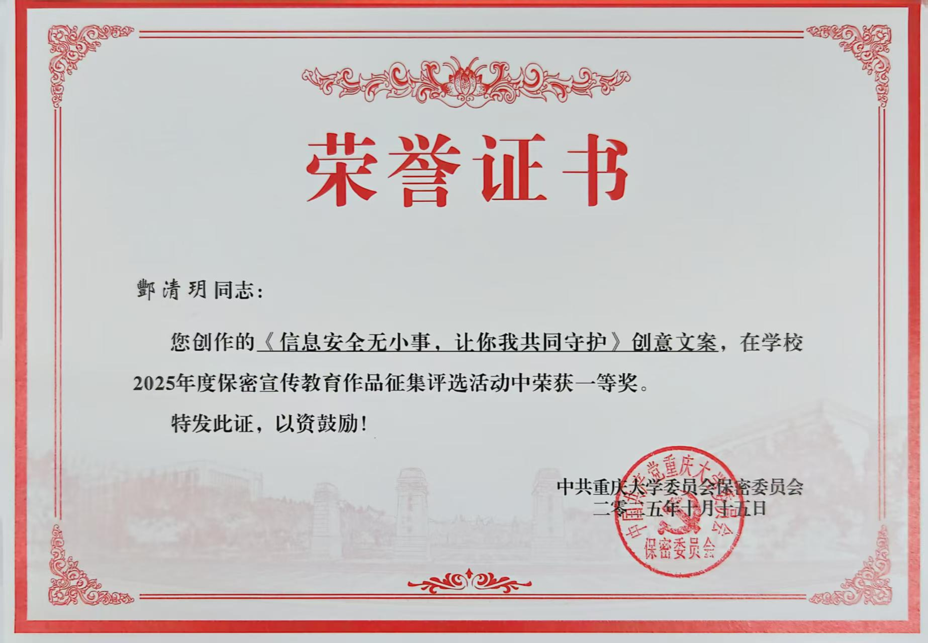 近日,污污漫 保密宣传教育作品征集评选活动结果正式揭晓,*污污漫 学子凭借新颖的创作思路与出色的作品呈现,在众多参赛作品中脱颖而出,斩获多项荣誉,共10名同学9件作品获奖,其中一等奖1项、二等奖2项、三等奖4项、优秀奖2项,展现了学院在保密宣传教育工作中的突出成效。酆清玥同学的作品《信息安全无小事,让你我共同守护》荣获一等奖;袁节同学的作品《贯彻落实保密法,你我都是护密人》和尹兴欣同学的作品《保护国家...