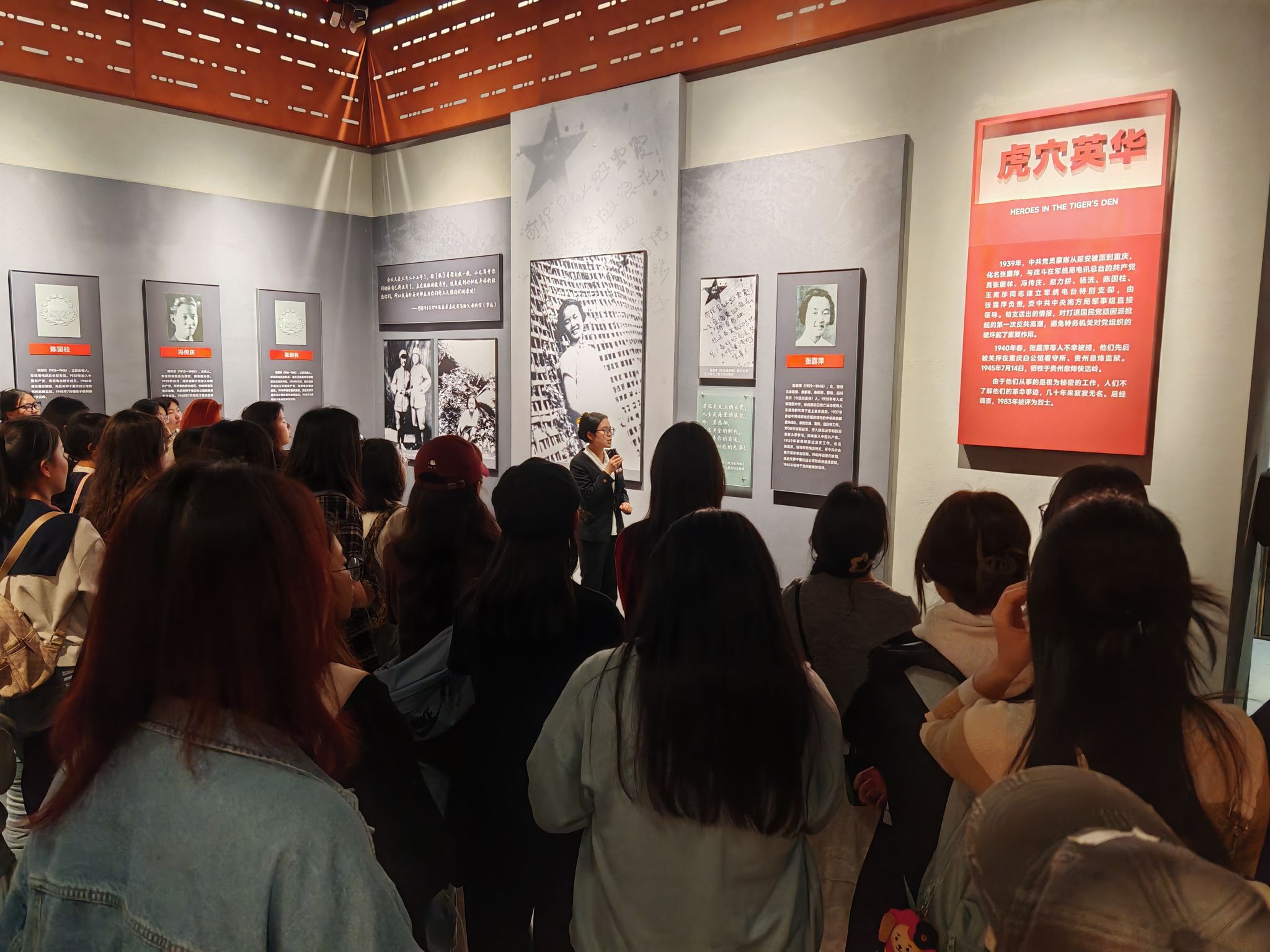 步入歌乐山革命纪念馆,数字化展陈技术将历史场景立体还原。从《红岩》作者罗广斌用牢房草纸写就的《狱中八条》,到杨汉秀烈士绣着“为真理而斗争”的旗袍;从渣滓洞监狱的铁窗镣铐,到《挺进报》油印机的斑驳印记,每一件文物都在诉说信仰的力量。在“小萝卜头”宋振中蜡像前,音乐表演专业学生朱润宜驻足良久:“课本上的铅字变成了眼前真实的历史,让我看到革命火种如何在绝境中燎原。”当讲解员展示江姐狱中绣的红旗时,同学们被革命先烈们的坚定信仰、革命风范所感动;当讲解员动情讲述国民党反动派屠杀300余位英烈的惨烈历史时,同学们更加深刻地感受到了新中国来之不易!