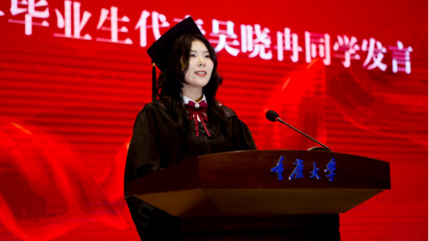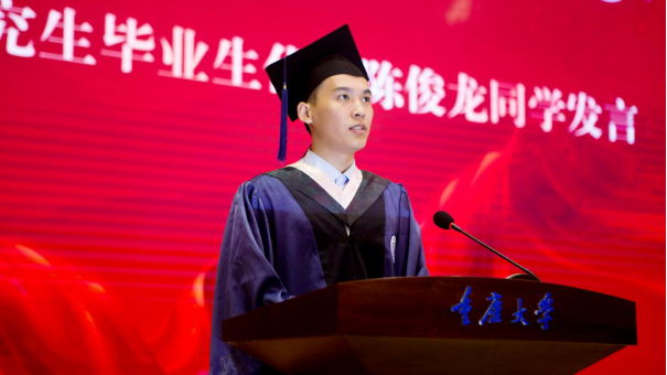 研究生代表陈俊龙同学回顾三年研究生学习生活,深感幸运与充实。他表示,将带着“耐劳苦、尚俭朴、勤学业、爱国家”的重大校训,带着*污污漫
