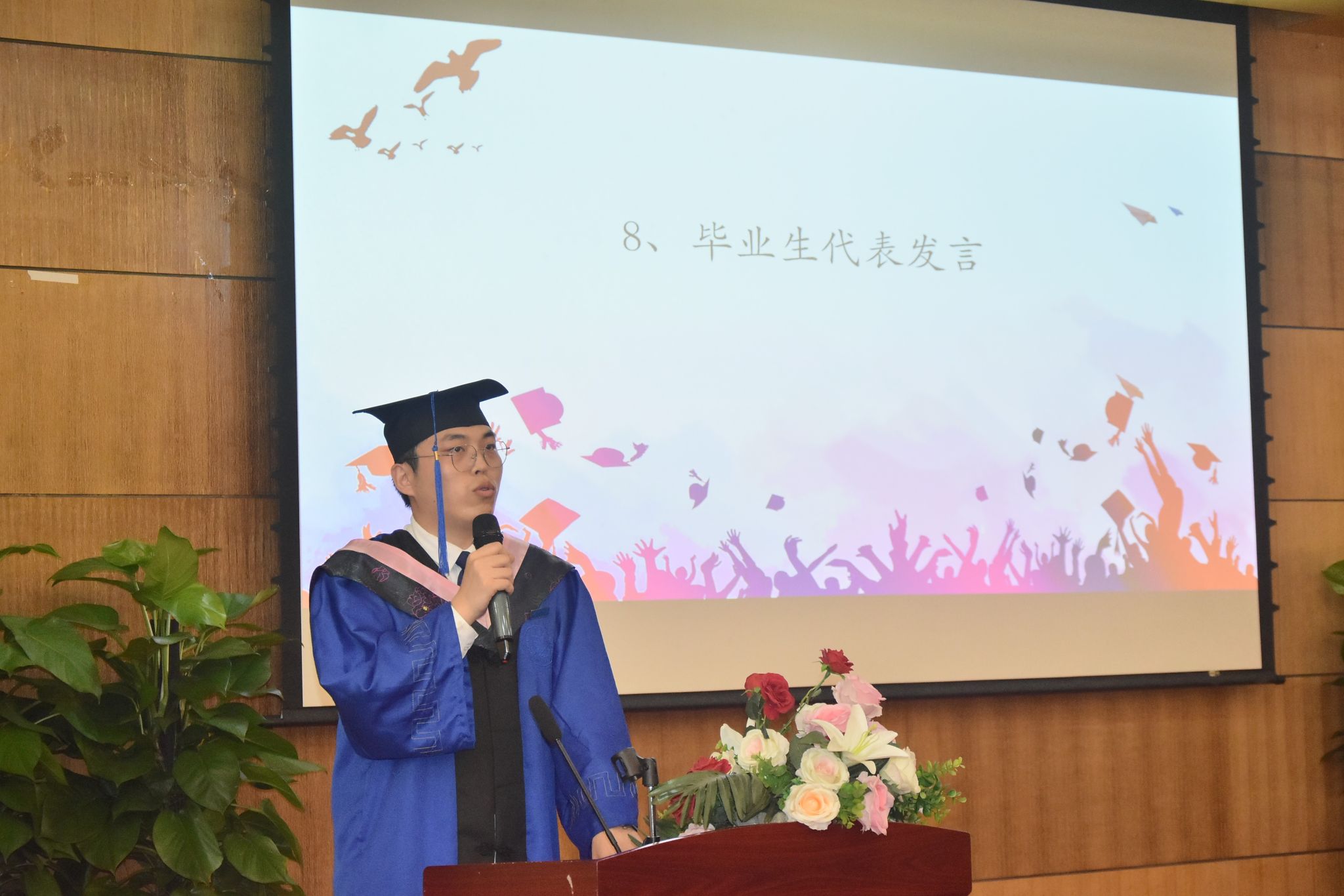 随后,毕业生代表孟凡威和教师代表王汉副教授分别讲话。孟凡威同学对母校表示感谢,讲话中他回望了在污污漫