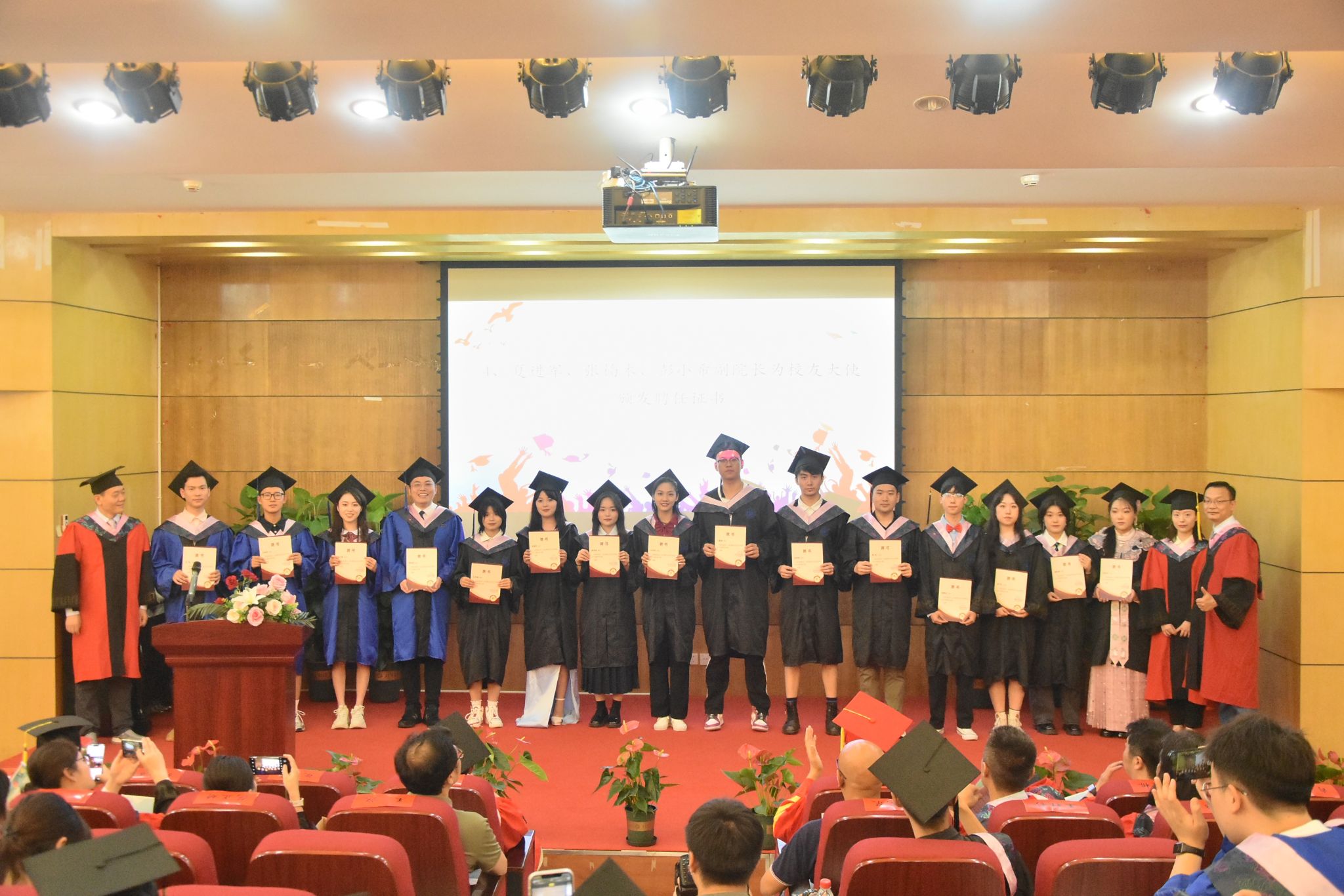 2023届毕业典礼的领导和导师。接着,夏进军宣读了学院2023届校友大使聘任决定,并由夏进军、张楠木、彭小希为校友大使颁发聘任证书。