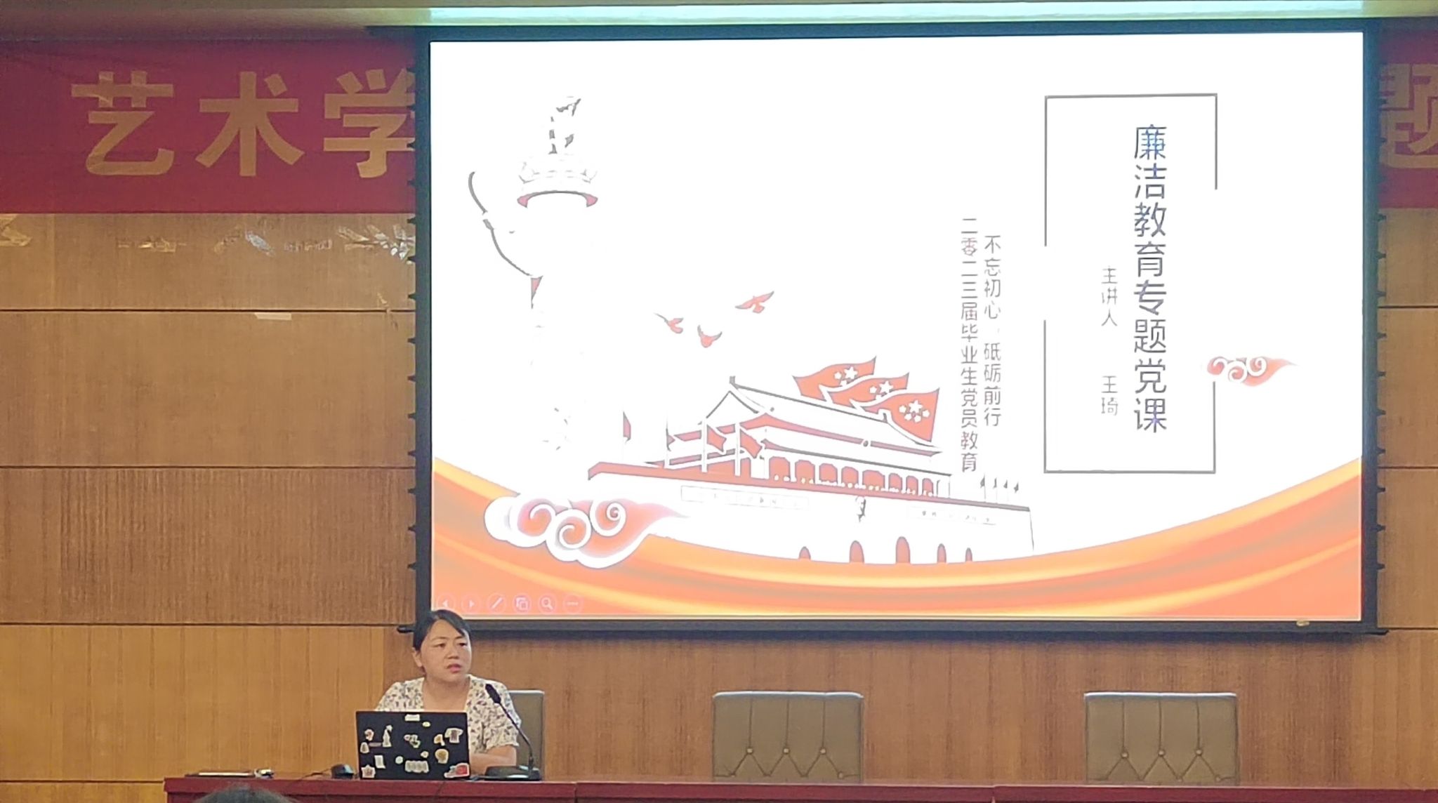 在二楼报告厅开展毕业生党员集中教育,学院纪委书记、党委副书记王琦作《不忘初心 砥砺前行》廉洁教育主题党课,学院全体毕业生党员聆听党课,会议由学院党委组织员曲卫红主持。
