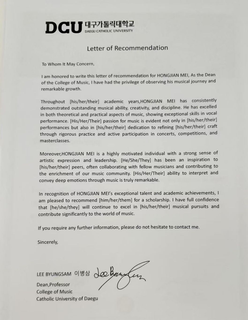 在本次比赛中,音乐系副主任喻思言副教授与黄慧老师,带领学生高晨曦、尹艺萌、梅洪健、谭智荣、鲁敬贤参与美声大学组的角逐。比赛期间,梅洪健凭借扎实深厚的专业功底和极具感染力的舞台表现力,充分展现出重庆大学艺术学院音乐系学子的风采。其在赛事中的优异表现也获得了评委们的高度认可,韩国大邱加图立大学音乐学院院长李炳杉教授亲自授予梅洪健该校研究生offer。