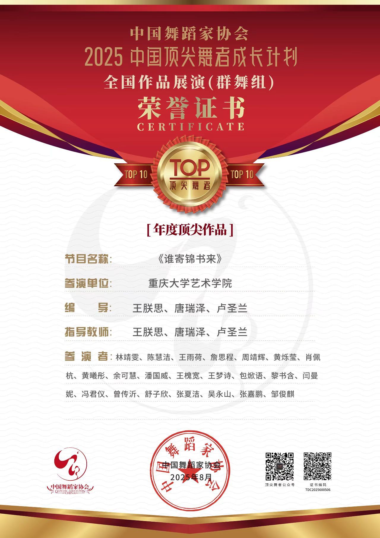 在刚刚公布的“2025中国顶尖舞者成长计划”(群舞组)年度推选结果中,重庆大学艺术学院两部舞蹈作品载誉而归,其中《谁寄锦书来》斩获“年度顶尖作品(群舞组)”,《岩魂》荣获“年度优秀作品(群舞组)”。