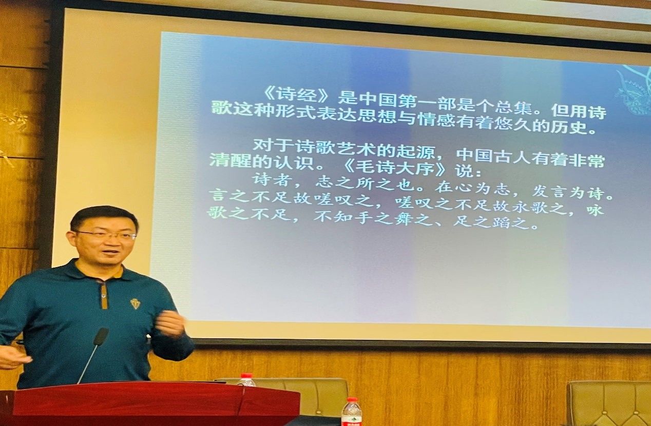 雒三桂教授告诉同学们,《诗经》与中国传统文化有着极其密切关系,中国传统文化以勤劳与仁义礼智信为核心。在传统文化的发展中,《诗经》是我国第一部诗歌总集。今天我们在鉴赏《诗经》时,不能仅把《诗经》看作文学作品,更要关注其自我批判的部分。