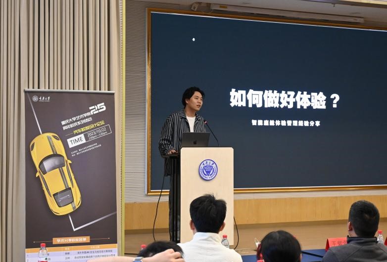 20余名汽车设计界的校友受邀参加了本次设计分享会,5名来自长安、赛力斯等汽车公司的校友进行了精彩的演讲,分享他们在汽车设计领域所获得的行业经验与前沿资讯。来自赛力斯的校友杨柳以《海外车载HMI设计新挑战》为主题与大家分享了海外车载HMI交互与视觉设计的相关要求。杨柳介绍了当前新能源车出口大背景,他认为海外HMI设计难点主要分为两大类,包括语言、文化等在内的人文差异,左右舵使用、时区差等在内的差异。