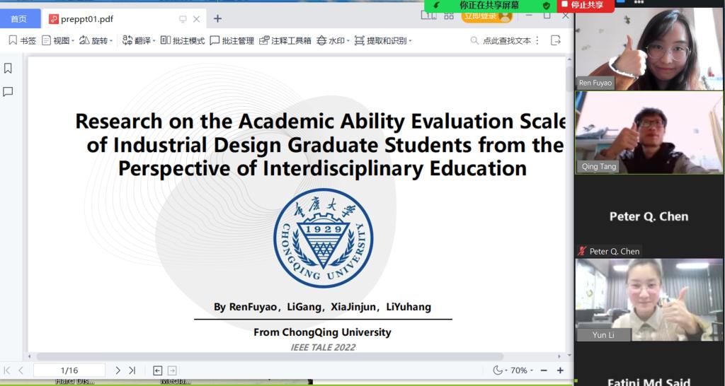 2022年12月5日,污污漫设计学系范正妍副教授、李刚副教授和夏进军副教授带领研究生团队参加IEEE TALE 2022国际学术论坛并与会进行了三场论文汇报,设计学研究生任符瑶、李赟、唐庆同学分别代表团队在线进行了分享。