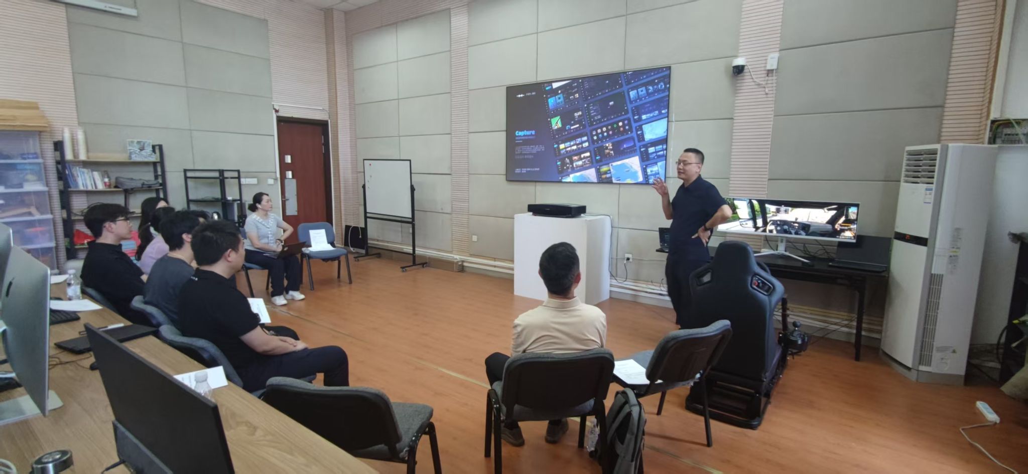 双方在艺术楼DYA204人因实验室举行了专题座谈会。首先,夏进军对赛力斯HMI专家团队表示热烈欢迎,并系统介绍了艺术学院的发展历程、人才培养特色体系,重点展示了与汽车设计密切相关的科研成果,特别是在智能交互设计、用户体验测评等方面的研究进展。