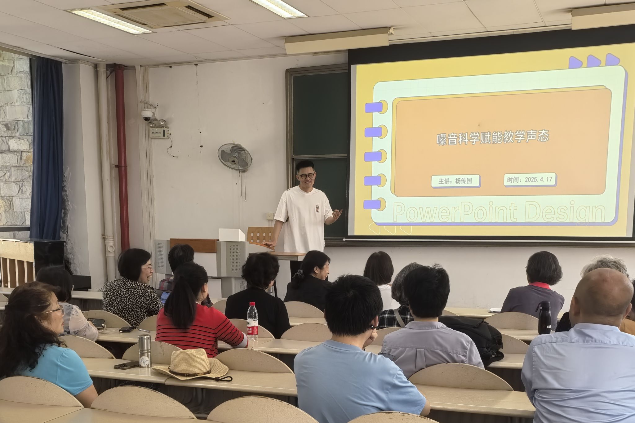 2025年4月17日下午2:30,由重庆大学工会主办、艺术学院分工会承办的"‘玫瑰书香’阅读活动——嗓音科学赋能教学声态"主题讲座,在虎溪校区综合楼DZ122教室举行。艺术学院教师杨传国以专业嗓音训练为核心,为现场教职员工带来一堂兼具科学性与实用性的声音艺术课。艺术学院分工会主席王朕思、副主席李杰,校内有关分工会50多位教职工到现场参加。