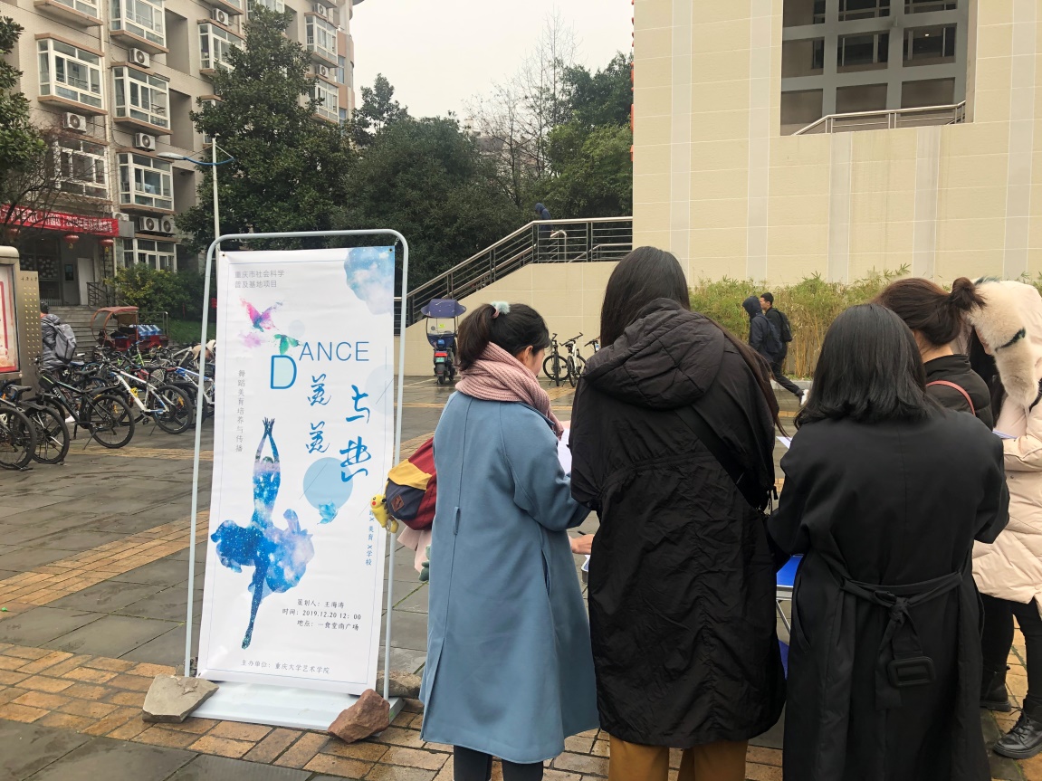 2019年12月20日中午,艺术学院王海涛副教授作为此次活动的负责人,带领舞蹈学研究生团队,在重庆大学虎溪校区一食堂南广场举办了“重庆市社会科学普及基地“2019年科普系列活动之一《美美与共——舞蹈美育培养与传播》科普活动。本次活动主题鲜明,形式多样,趣味十足,引来大批学生驻足,并积极参与活动。现场气氛活跃,科普活动圆满成功。