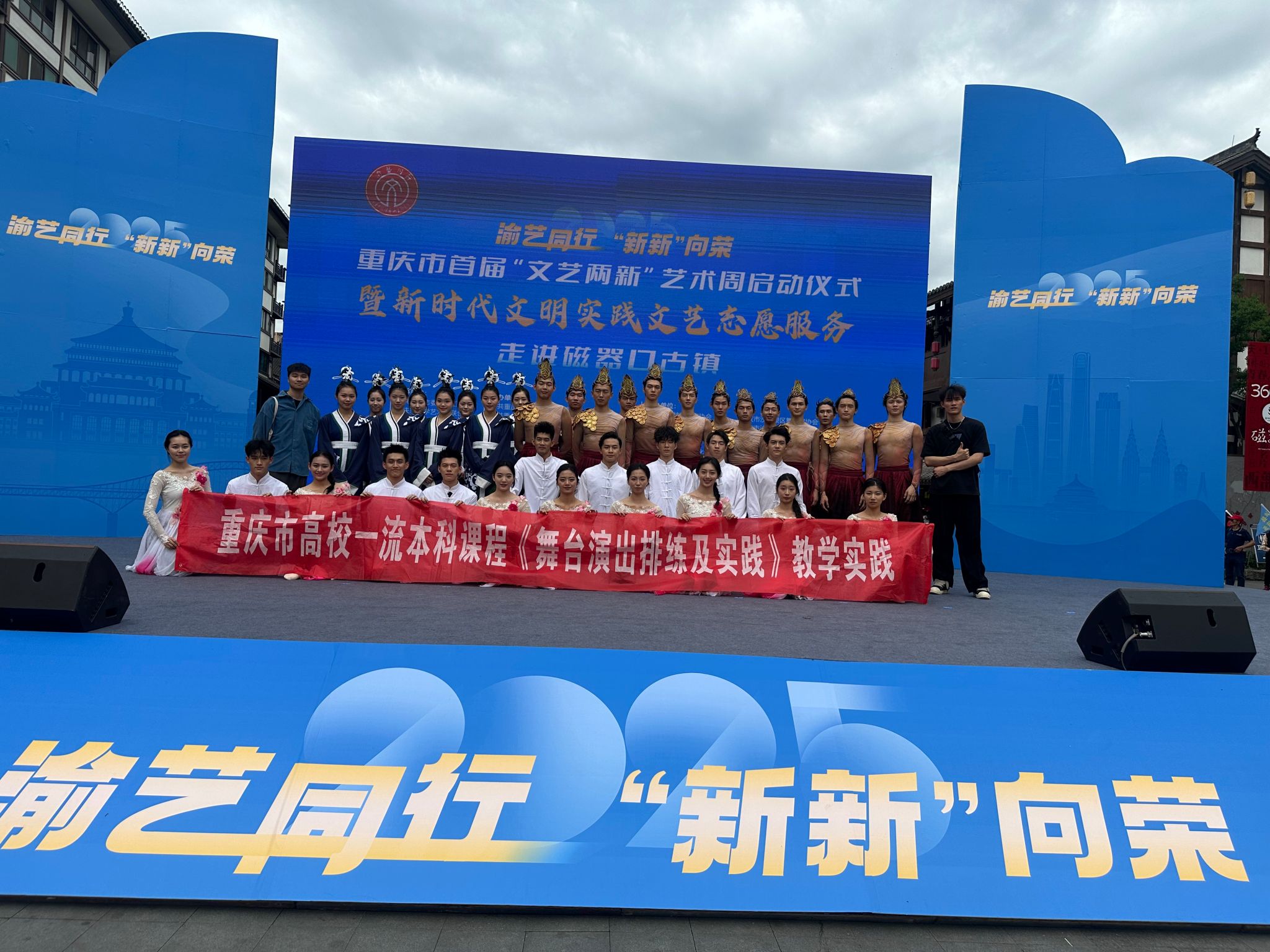 2025年5月9日上午,由重庆市文联等单位主办的渝艺同行“新新”向荣——重庆市首届“文艺两新”艺术周启动仪式暨新时代文明实践文艺志愿服务活动在磁器口古镇举行。在沙坪坝区文联、沙坪坝区舞蹈家协会的组织协调下,艺术学院舞蹈系、音乐系师生携三部原创作品亮相舞台,以精湛的技艺与深厚的文化底蕴为活动注入青春活力,展现了学院在服务社会、推动“文艺两新”高质量发展中的突出贡献。