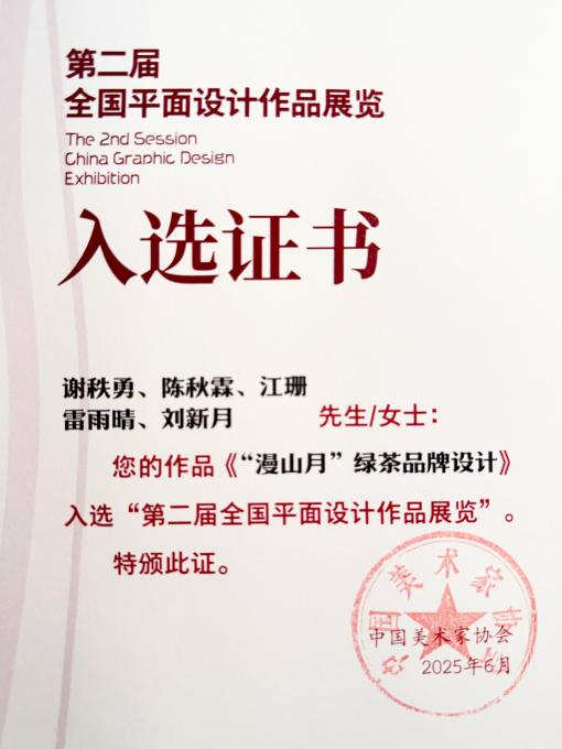 近日,由中国美术家协会主办的“第二届全国平面设计作品展览”评选结果揭晓,重庆大学艺术学院设计学系副教授谢秩勇带领研究生团队创作的设计作品《“漫山月”绿茶品牌设计》凭借创新设计语言和传统文化表达,在品牌标志类作品中脱颖而出,成功入选。